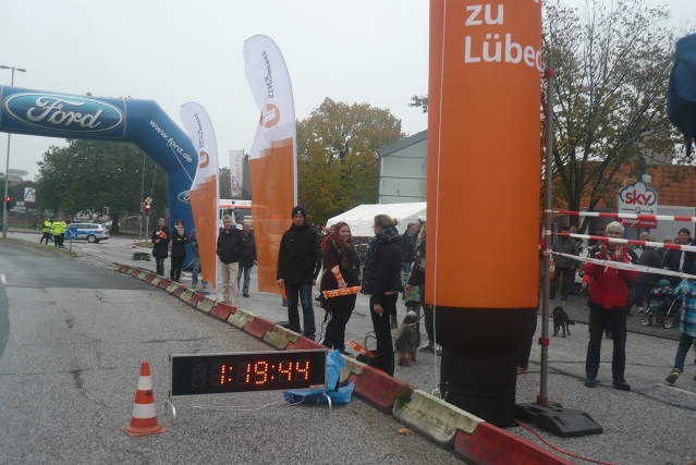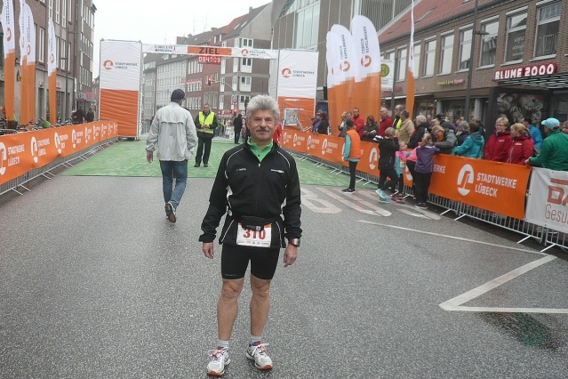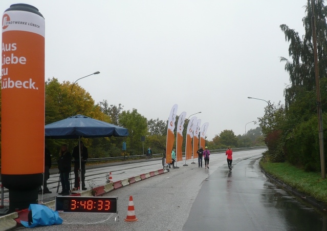 Endlich kommt Lübeck in Sicht, zuerst die Sportplätze des Lübecker Sportvereins „Gut Heil“, dann der Park am Jerusalemberg. Burgtor, Kilometer 40 und 41 sehe ich nicht, es geht in die Innenstadt. Leider fängt es etwas zu tröpfeln an, aber wurscht, ich bin gleich im Ziel. Was wird es für eine Zeit? Im Altstadtbereich lese ich eine Uhrzeit ab und rechne. Das dauert länger, als mit klarem Verstand. Es geht vielleicht unter 3.15 aus. Das wäre die beste Zeit der letzten zwei, drei Jahre.