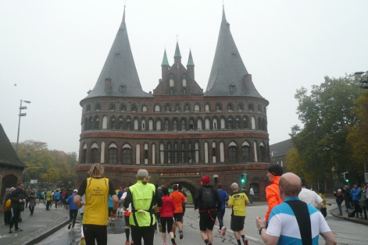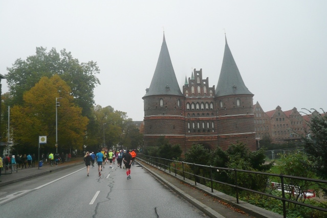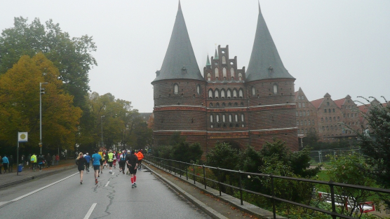 Nach einigen Informationen und motivierenden Sprüchen des Moderators zählen wir die letzten Sekunden herunter und wir werden auf die Strecke geschossen. Sofort können wir es die Holstenstraße hinunter zur Holstentorbrücke laufen lassen, aber überpacen sollte man es jetzt noch nicht. Ein überaus guter Start: wir laufen sogleich auf das Holstentor zu, das Teil der Stadtbefestigung war.