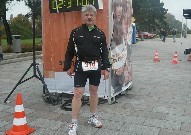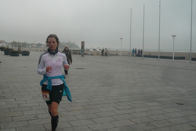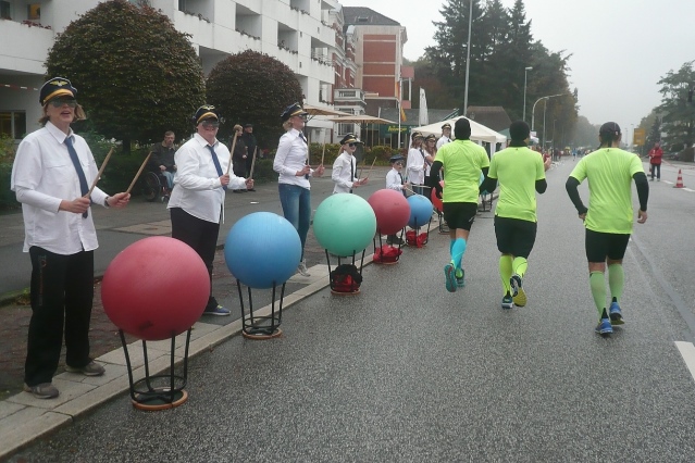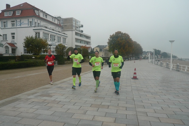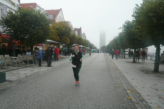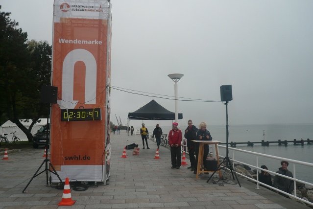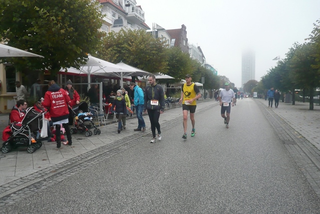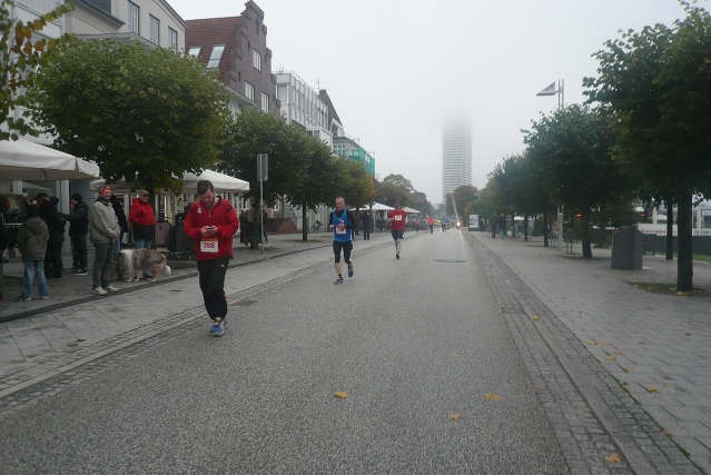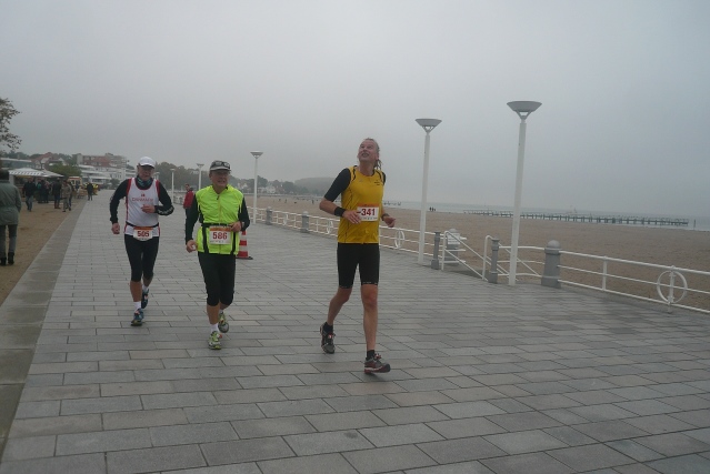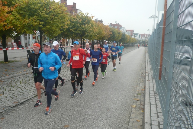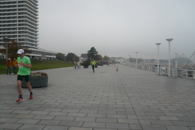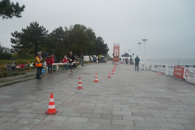 Ich biege nach links auf die Strandpromenade ab. Feinstes Pflaster, überhaupt nicht uneben und gut zu belaufen, da freuen sich die Beine. Die Wende ist nah. Dann sehe ich das Führungsfahrzeug auf mich zukommen. Und damit ich mir die Zeit vertreiben kann, beschließe ich, zu zählen, an welcher Stelle ich nun liege. Hoffe, dass ich unter den ersten Hundert bin.