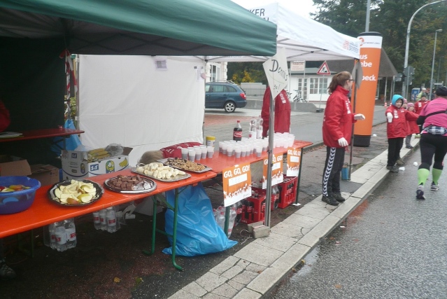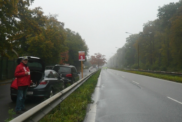 Ich komme gut ins Rennen, die kühle Witterung kommt mir entgegen. Ein langärmeliges Shirt war die richtige Wahl am Start, denn mir ist es jetzt weder zu warm noch zu kühl. So muss ich nicht bei jedem Getränkeangebot zugreifen und kann durchlaufen. Auf der Allee sind bereits zwei Stellen, wo wir mit Musik und Moderation unterhalten werden.