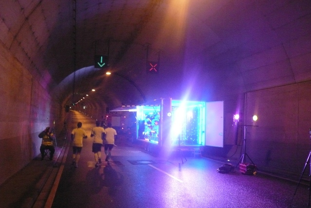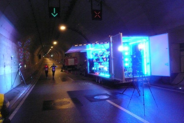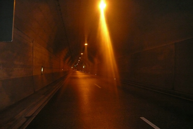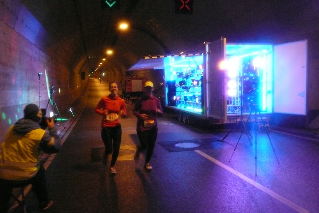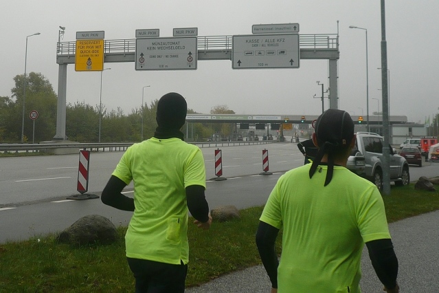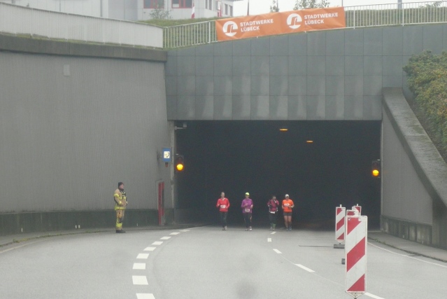 Der 866 Meter lange Tunnel verbindet Lübeck mit Travemünde auf kurzem Weg. Er ist Ersatz für die im Jahr 2006 abgebrochene Herrenbrücke. Der Tunnel ist mautpflichtig. Heute ist eine der zwei Röhren für uns gesperrt. Einschließlich der Rampe laufen wir rund 500 Meter an Gefälle nach unten. Mit einem 6prozentigen Gefälle brettern einige schnelle Hirsche hinunter. Und was die Lübecker hier unten an der Sohle bieten ist super: Laute Musik, viele Lichter, Blitze, tolle Stimmung. Einfach geil.