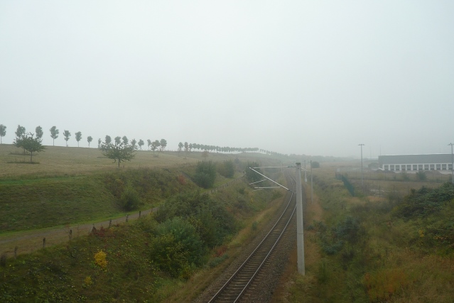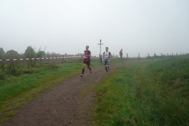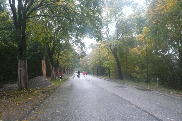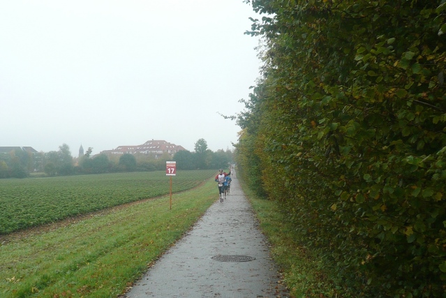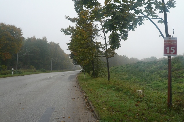 Auf der Travemünder Landstraße verlassen wir Kücknitz auf einem Radweg. Nur wenig später sehe ich eine Alleereihe auf einem vielleicht 15 bis 20 Meter hohen Damm. Bei genauerem Hinsehen entdecke ich darauf Menschen. „Wir müssen doch nicht?“ frage ich mich insgeheim. Und dann verläuft die Strecke scharf links herum, über eine Bahnlinie und dann steil aufwärts auf einem Splittweg nach oben. Gut, dass ich mir heute früh die Trailschuhe angezogen habe. Die haben mir bisher auf dem nassen und teilweise rutschigen Geläuf einen guten Dienst erwiesen. Auf der anderen Seite des Dammes geht es genauso steil hinunter. Und wer unkonzentriert hinunter läuft, kann sich an einer der wenigen Wasserlachen feuchte Füße holen.