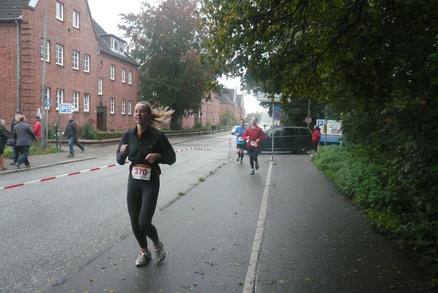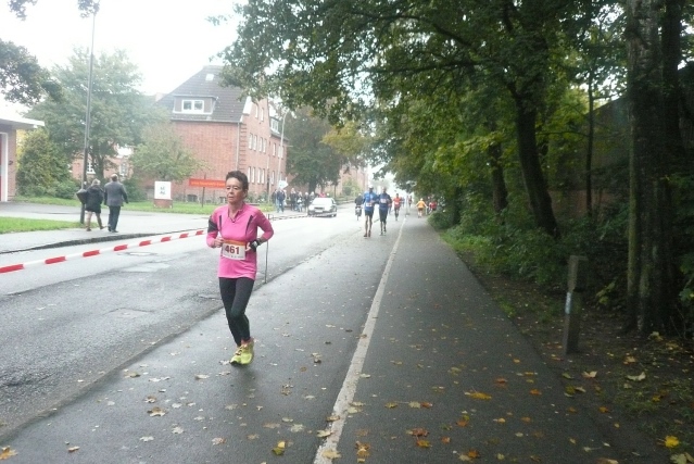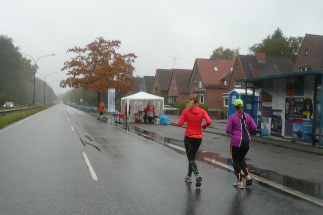 Kilometer 31, Kücknitz. Kurz darauf kommt die Wendestelle der Halbmarathonis. Ich bin überrascht, dass noch viele Halbmarathonis auf ihrem Hinweg sind. Es dauert nicht lange, dann folgt der Besenwagen. Gleichzeitig werden es immer mehr Läufer, die ich einsammeln kann. Mit tut das gut und es baut auch auf. Kurz danach kann ich die zweite Frau einholen. Es dauert eine ganze Weile, bis ich sie abschütteln kann.