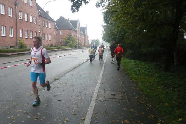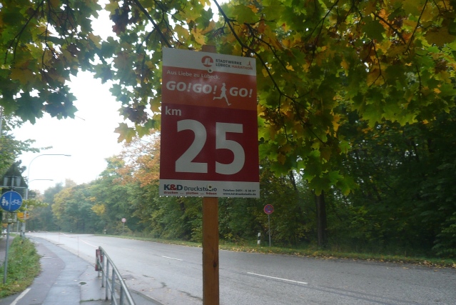 Im Herrentunnel löse ich meine Bremsen und brettere hinunter, was geht. Weiterhin wird hier laute Musik gespielt. Beim Anstieg muss ich jetzt zwar deutliche das Tempo zurücknehmen, aber ich kann im Gegensatz zu den meisten Halbmarathonis durchlaufen. Noch sechs Kilometer. Ich werfe mein letztes Gel in die Waagschale, sprich in den Rachen. Ein wenig mühselig wird die lange Travemünder Allee. Den vor mir laufenden Marathoni verliere ich nicht aus den Augen, auch der wird jetzt auf der letzten Rille laufen, genau wie ich.