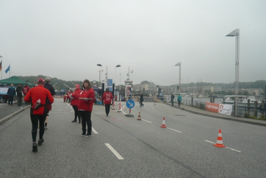 Im Bereich der Priwall-Fähre wird die Kurve geschnitten. Warum die Entgegenkommenden im Kurvenäußern und auf dem nach außen hängenden Untergrund laufen, ist mir ein Rätsel. Vielleicht dass man nicht auf dem groben Pflaster laufen muss. Ich halte mein Tempo und verlasse Travemünde. Das erste Gel wird verdrückt.