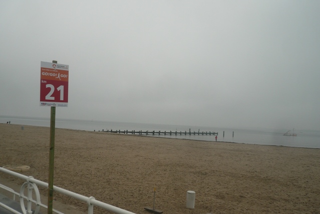 Am Sandstrand sind nur wenige Spaziergänger und Hunde unterwegs, der Spielplatz ist verwaist. Zuerst kommen nur einzelne Marathonis entgegen, dann sind es kleine Grüppchen. Der eine oder andere hebt sogar die Hand zum Gruß. Kilometerschild 21, rund 500 Meter danach befindet sich die Wende. Und bis dahin habe ich 38 Läufer gezählt. Mein Platz ist 39. Kann ich das bis zum Schluss halten? Die Uhr an der Wende zeigt eine 1.35 Stunden an. Da kann ich für Zwischenzeit des Halben vielleicht zwei Minuten abziehen. Es geht zurück.