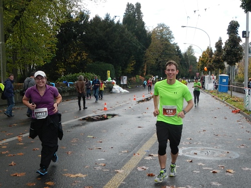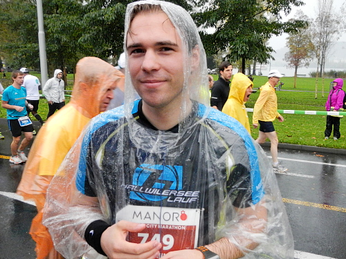 Trotz strömendem Regen mache ich eine gute Stimmung im langgezogenen Feld vor der Startlinie aus. Ernesto und Rita würde ich auf ihrem Hochzeits-Halbmarathon besseres Wetter wünschen. Sie beide strahlen aber wie mindestens zwei Sonnen zusammen. Dazu kommt noch ihre ganze Begleitmannschaft mit Ghettoblaster auf Rollen im Schlepptau.