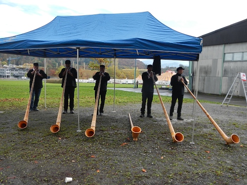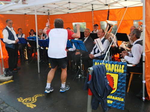 Meine Disziplin der Uhr gegenüber ist alleine nicht mehr so rigoros. Die letzten beiden einsamen Kilometer habe ich beschleunigt, da kommt ein Bedürfnis gerade recht. Die Alphornbläser und Helfer lachen schallend, wie ich ins blaue Örtchen verschwinde und dabei in einer zirkusreifen Aktion die Schnüre der beiden übergroßen Luftballons durch den oberen Türrahmen einfädle. Wenigstens kann niemand sagen, man hätte nicht jederzeit sehen können, wo ich war.