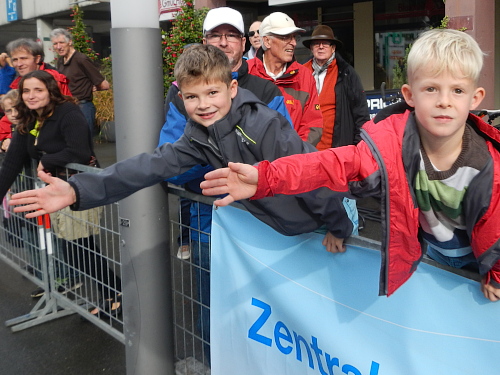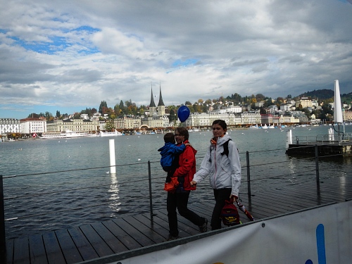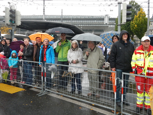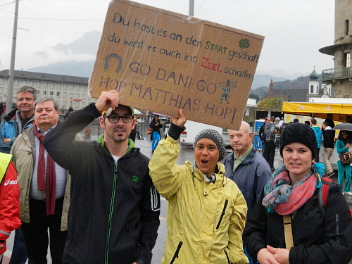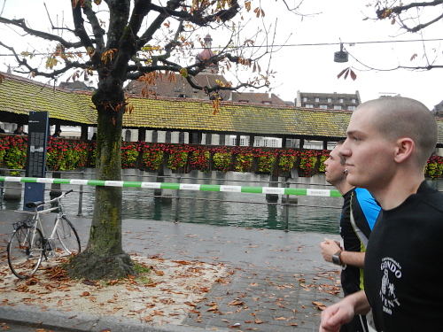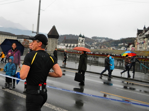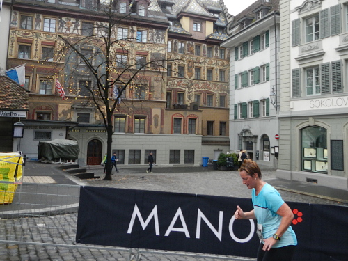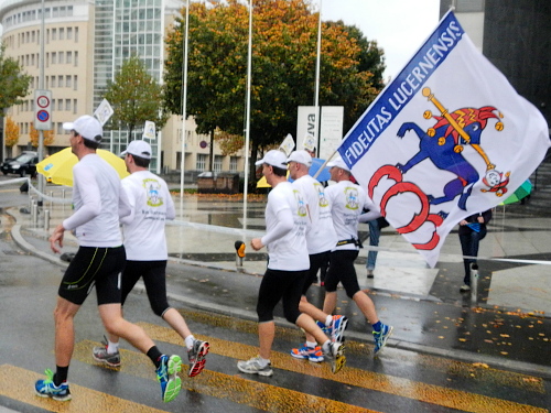 Schrebergärten, Allmend, links, rechts, links und die Bahnhofseinfahrt ist schon in Sicht. Neben dem Bahnhof liegt das KKL, es ist also nur noch ein kurzes Stück zum nächsten Highlight. Sphärisch ist der Empfang im Konzertsaal, den die Hauptakteure heute nicht durch den Künstlereingang betreten. Die auf dem blauen Teppich werden von den Zuschauern gefeiert und weiter zum nächsten Höhepunkt gereicht, der neuen Schlaufe durch die Altstadt. An der Kapellbrücke, der Jesuitenkirche und dem Regierungsgebäude vorbei geht es über die Brücke in die Altstadt hinein. Der Führende und der Zweitplatzierte des Marathons, welche mich hier überrunden, haben nicht die Zeit für die Schönheit der Bauensembles, werden dafür am Schwanenplatz noch frenetischer begrüßt, als unser kleines Ballontrüppchen.