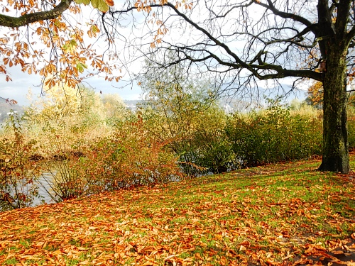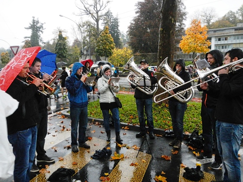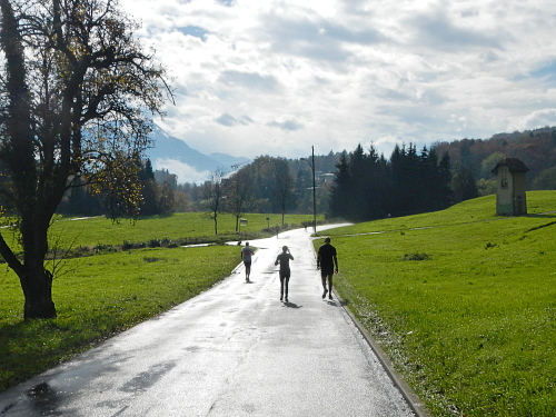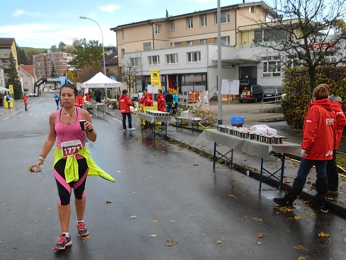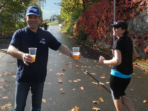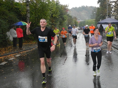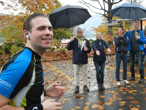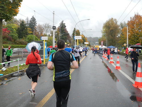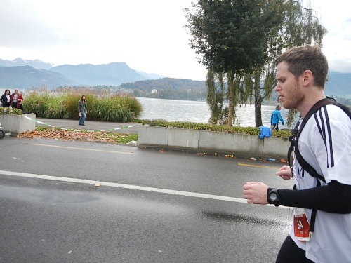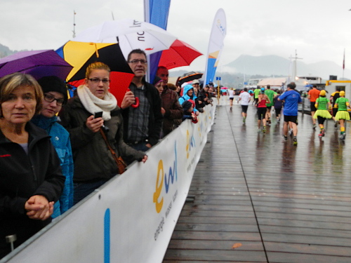 Die Zuschauer und Anwohner an den verschiedenen privaten Partys und Verpflegungsangeboten rund um die Horwer Halbinsel lassen sich vom strömenden Regen bremsen, da können die Aufhellungen auf der anderen Seeseite noch so höhnisch ihre Strahlen durch die Wolkendecke zucken lassen. Es ist wie immer, die Strecke kommt mir viel kürzer vor als sie ist und gefühlsmäßig entsprechend schnell bin ich im Zentrum von Horw. Von da sind es gemessene acht Kilometer bis zur Halbzeit, dann ist für die Halbmarathonis der Spaß schon vorbei. Einige von ihnen werden darüber nicht unglücklich sein, denn meine Einsammelquote steigt von hier an exponentiell.