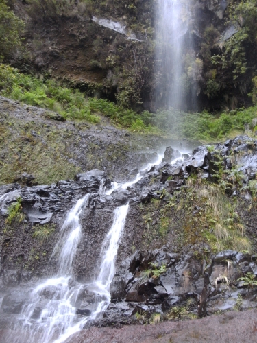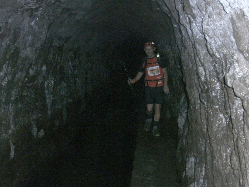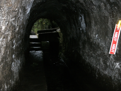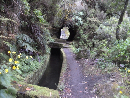 Für die 85er geht es denn bald wieder hinauf. Wir stoßen an eine Levada und können hier im Licht des beginnenden Tages recht bequem laufen. Die Levada führt uns an mehreren Wasserfällen vorbei und durch mehrere Tunnel. Gut, dass wir die Stirnlampen dabei haben.