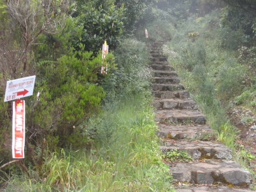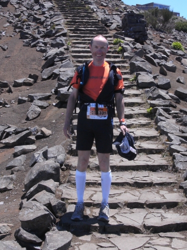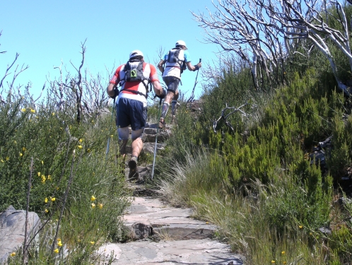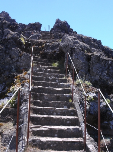 Viele Wanderer kommen uns entgegen. Alle treten bereitwillig zur Seite und lassen die Läufer passieren. Und es gibt Aufmunterung. Ich kämpfe Stufe um Stufe, Meter um Meter. Und dann liegen sie vor mir. Der imposante Treppenaufstieg über eine Kuppe und der schön ausgepflasterte Treppenaufstieg zum Gipfel. Ich kann mich gar nicht genug umsehen und das Panorama aufsaugen.