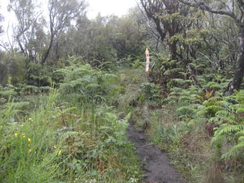 Die Wolken sind zurück. Trotz der nunmehr schlechteren Sicht ist ein Verlaufen kaum möglich. Die Strecke ist bestens ausgeschildert und markiert. Es flattern unzählige Fähnchen an Bäumen und Sträuchern, Markierungen sind in grüner Farbe auf dem Boden angebracht und Hinweistafeln weisen den Weg. Dazu die vielen Posten an jeder Straßenquerung und Trennung von 85ern und 115ern und als Kontrollposten an der Strecke.