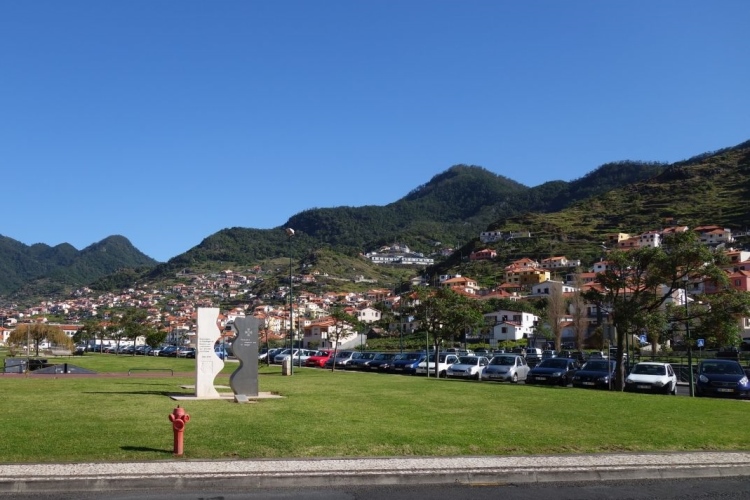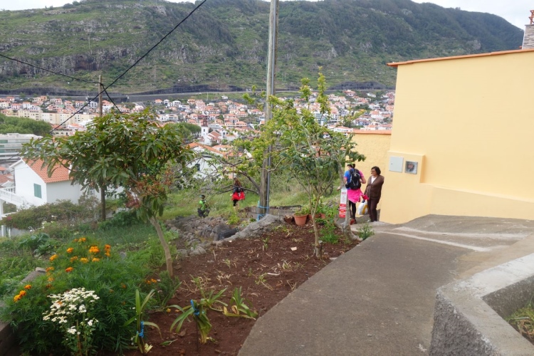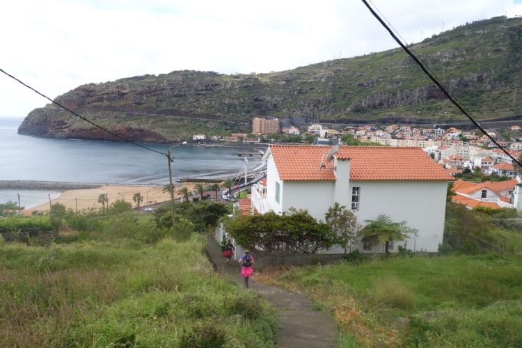 Ein kurzes Stück führt uns über ein steiles Sträßchen weiter aufwärts, hin zu den nächsten Treppen. Wir erreichen Häuser und auf Straße geht es weiter empor. Porto da Cruz wird immer kleiner und liegt schon weit unterhalb von uns .Die Strecke führt nochmals weg von der Straße. Über Treppen geht es hinauf zur nächsten Levada. Diese führt wieder zur Straße.