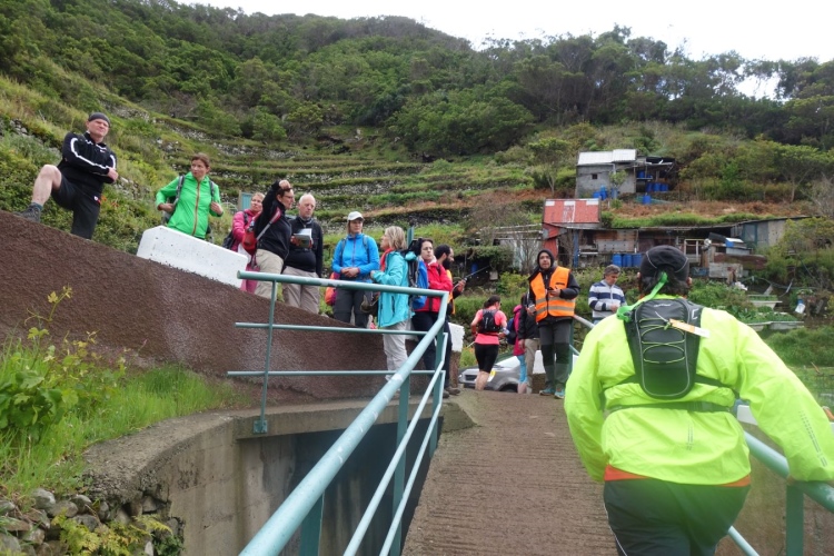 Am Wasserhaus queren wir die Straße, die auch gleich links im Tunnel verschwindet. Wir bleiben auf der Machico zugewandten Seite und steigen an einem Wasserreservoir wenige Meter abwärts zu einer erneuten Levada. Eine heikle Passage. Zwar nur ein kurzer Abstieg, aber wegen der Nässe nicht ohne. Die Levada hat zwar kein Wasser, dafür aber auch keine Höhenunterschiede.