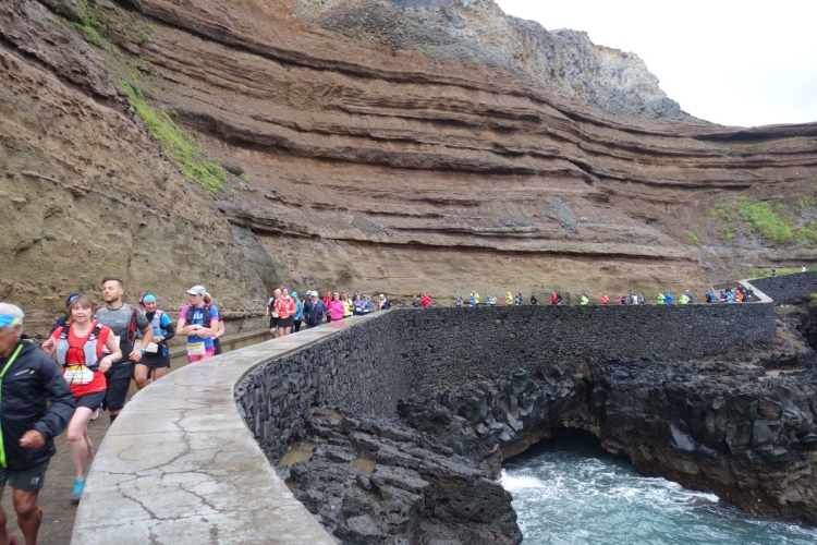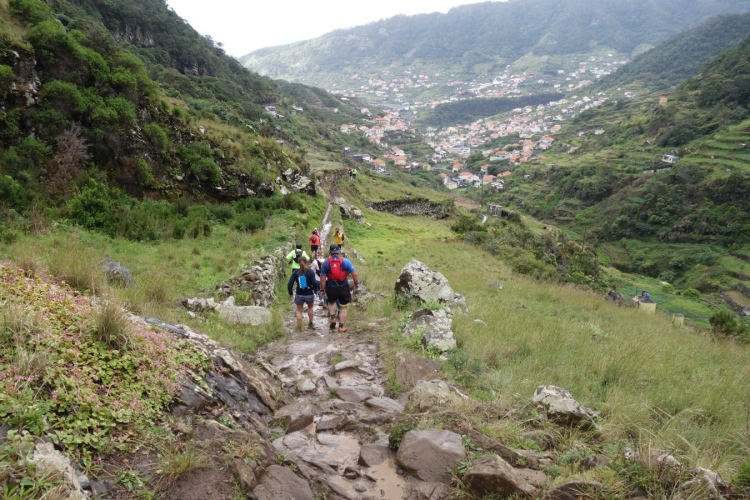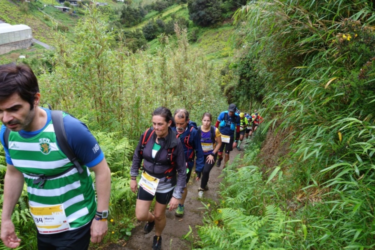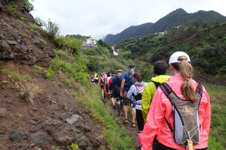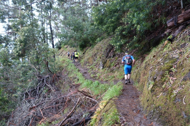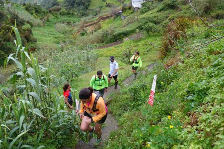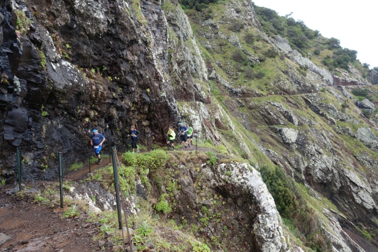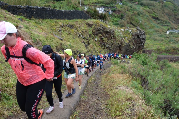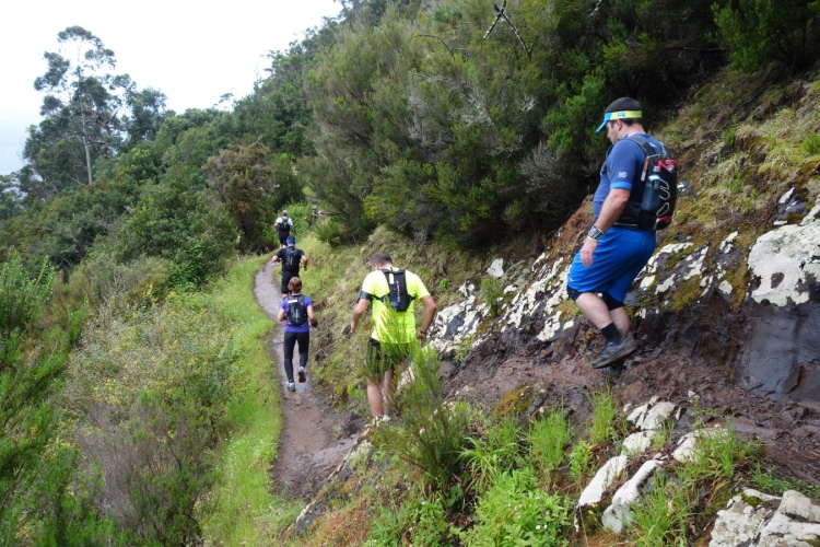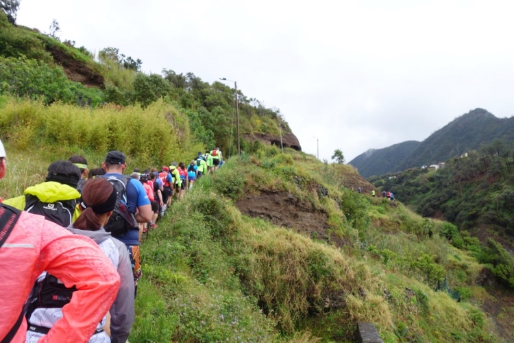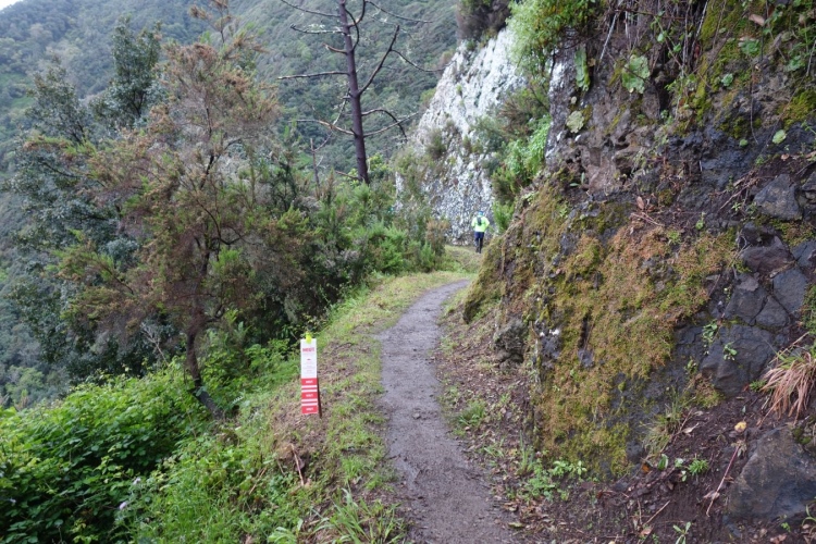 Ein Schild weist die Läufer darauf hin, dass es bis zur zweiten VS beim Mini in Ribeira Seca noch 7,5 Km sind. 80 Hm hinauf und 175 Hm runter. Auf einer breiten Piste geht es, aber schon bald sind wir für einige Kilometer auf einem schmalen Pfad. Absolut spektakulär! Die Ausblicke sind überwältigend.