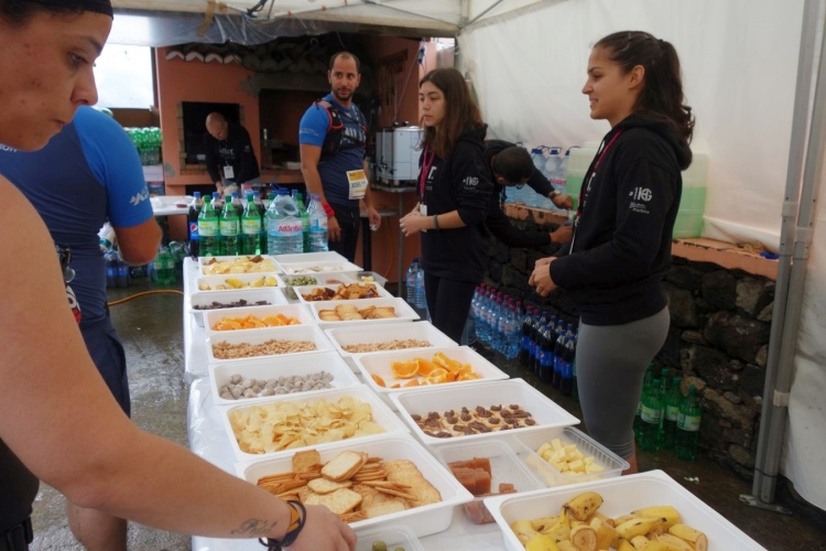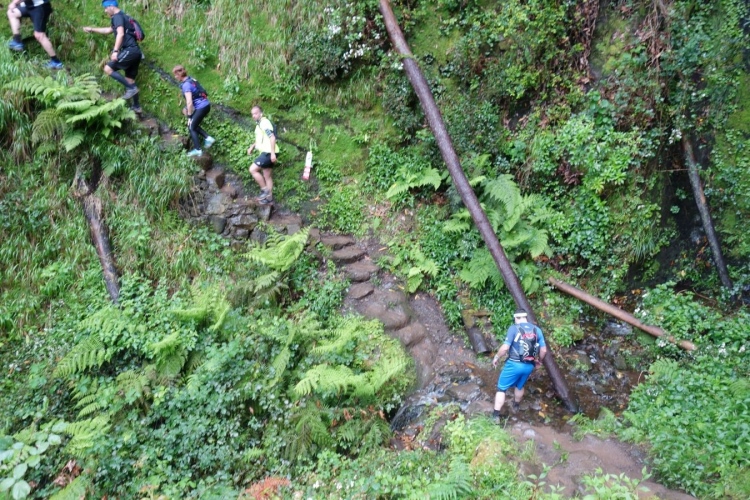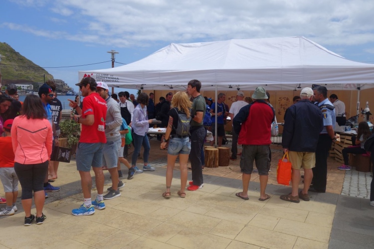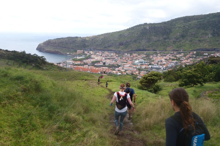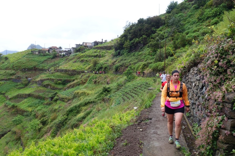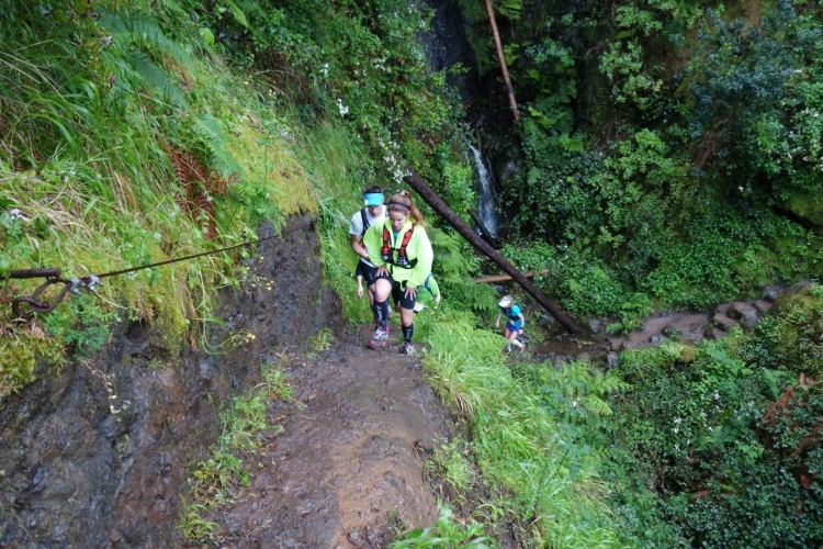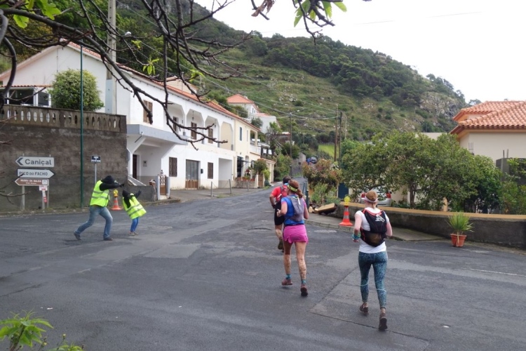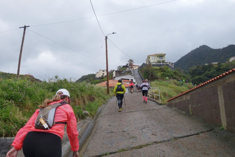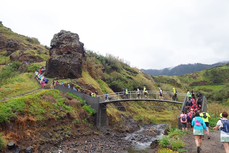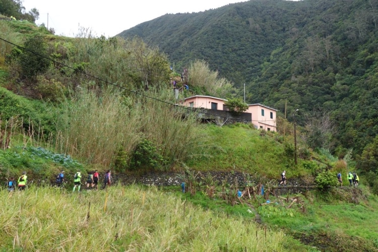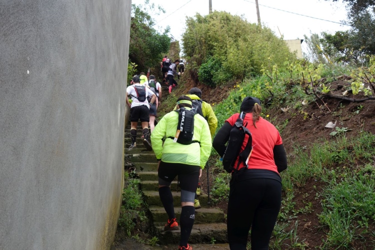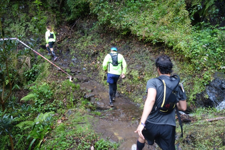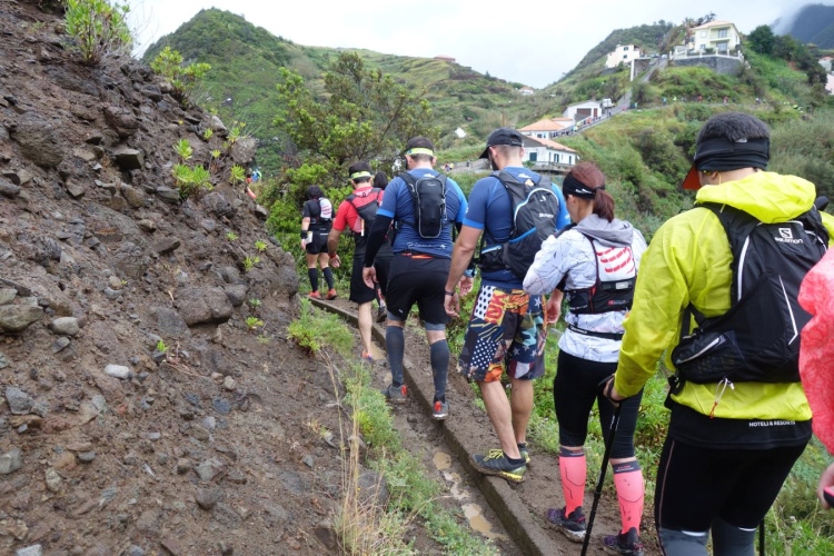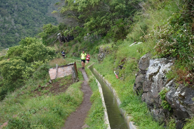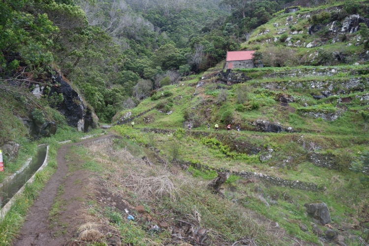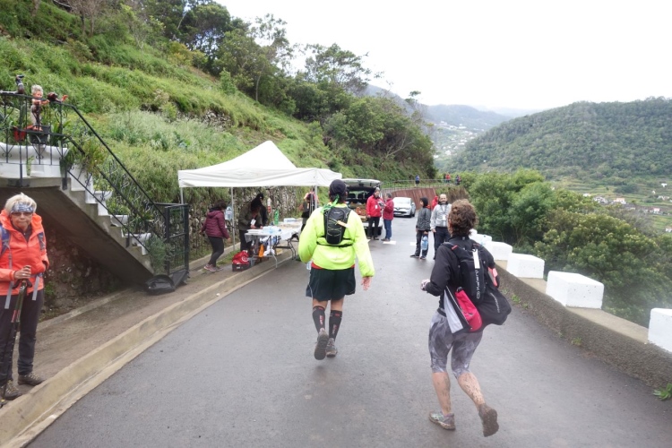 Eine Straße wird gequert und die Startnummern werden erfasst. Auf der anderen Straßenseite laufen wir entlang der Levada weiter. Vorher stärken wir uns an der zweiten VS des Mini. Noch 4 Km 220 HM abwärts sind es bis zum Ziel.
