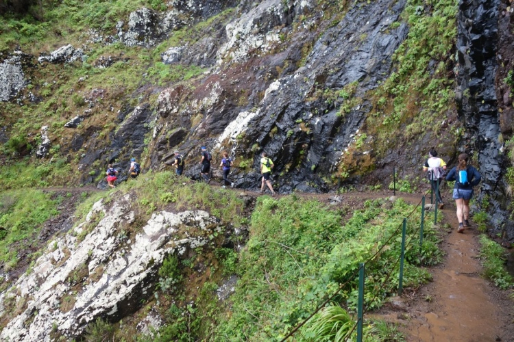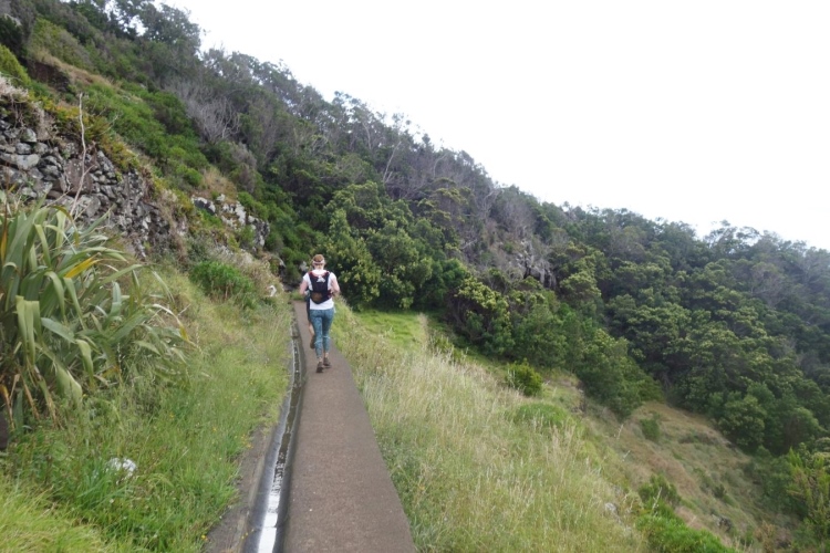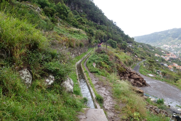 Dank des Regens der letzten Nacht ist der schmale Weg parallel zur Levada richtig schön matschig, Pfützen stehen auf dem Weg und man muss weiterhin aufpassen, wohin man tritt. Der Wasserkanal führt uns mit minimalem Gefälle ohne Auf und Ab dem Ziel entgegen. Dafür müssen wir allerdings jede Biegung des Berges mitmachen.