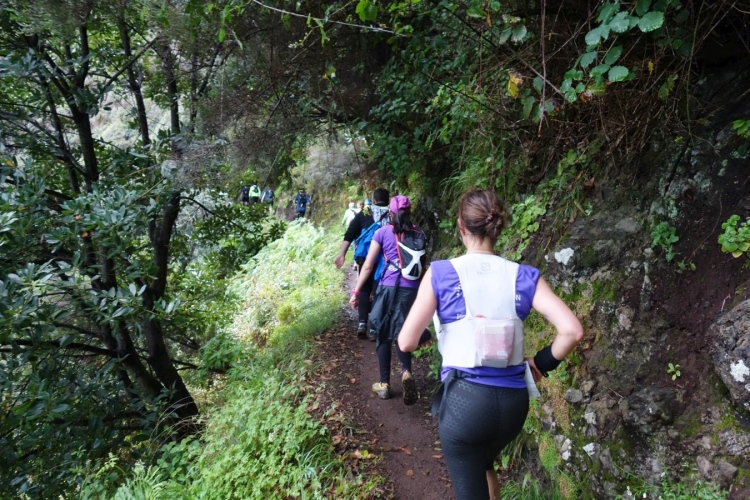Eine erste Levada wird erreicht und lässt uns einige Meter auf gerader Strecke Luft holen vom Anstieg. Auch hier ist es auf dem schmalen Weg entlang des Wasserkanals sehr matschig. Obacht ist angesagt. Der Regen hat übrigens aufgehört. Mir wird warm. Ich lasse dennoch die dünne Regenjacke zum Schutz gegen den Wind an.