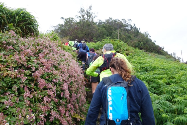 Eine kleine Brücke bringt uns weg vom Strand über einen Bach. Direkt nach der Ponta da Maia beginnt das große Steigen nach Larano. Stufen führen uns hinauf. Und schon bin ich ausgebremst. Auf den Stufen ist Überholen nahezu unmöglich. Nach den Stufen kommen alte typische mit kleinen Steinen gepflasterte Wege, auch schön steil. Diese Wege findet man auf der ganzen Insel.