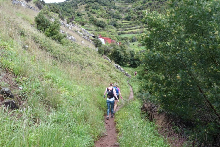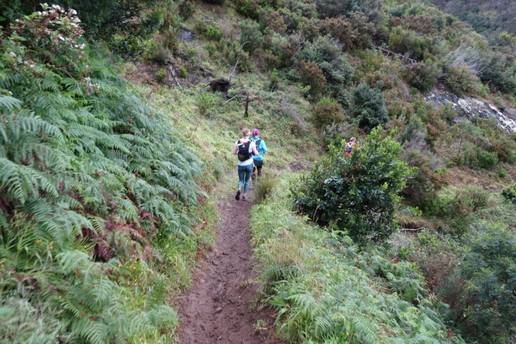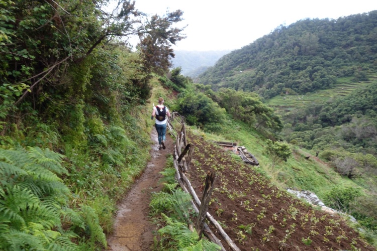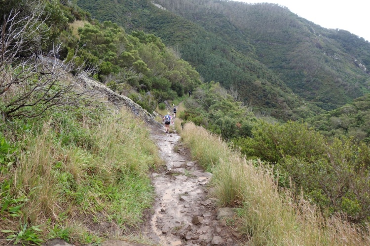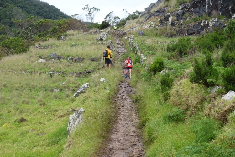Es geht ordentlich abwärts. Und das mit richtiger Matschpampe. Die oberen Regionen im Norden Madeiras sind noch stark bewaldet. Kurz hinter der Passhöhe kommt links ein Gehöft. Wir laufen auf steinigem Untergrund. Vorsicht ist angebracht, die Steine sind glitschig aufgrund der Nässe. Nach einer Weile wird der Untergrund jedoch einfacher zu laufen.