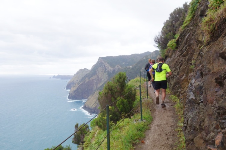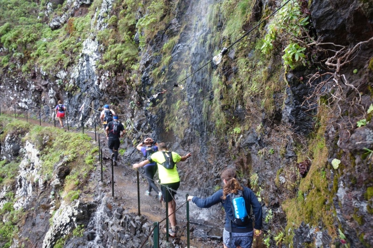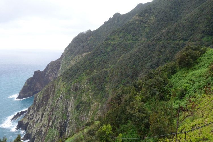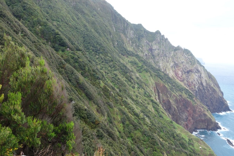 Der Pfad windet sich weiterhin sehr spektakulär und ausgesetzt entlang der Nordküste. Mehrere Passagen sind gesichert. Es tun sich Abgründe von 300m Tiefe mit fantastischen Blicken auf. Aber man sollte sich nicht zu sehr ablenken lassen, sonst ist man schnell eben diese 300m tiefer unter. Zwei Wasserfälle lassen ihr Wasser auf uns herunter. Bei Sonne wären sie eine willkommene Abkühlung. Jetzt eher nicht.