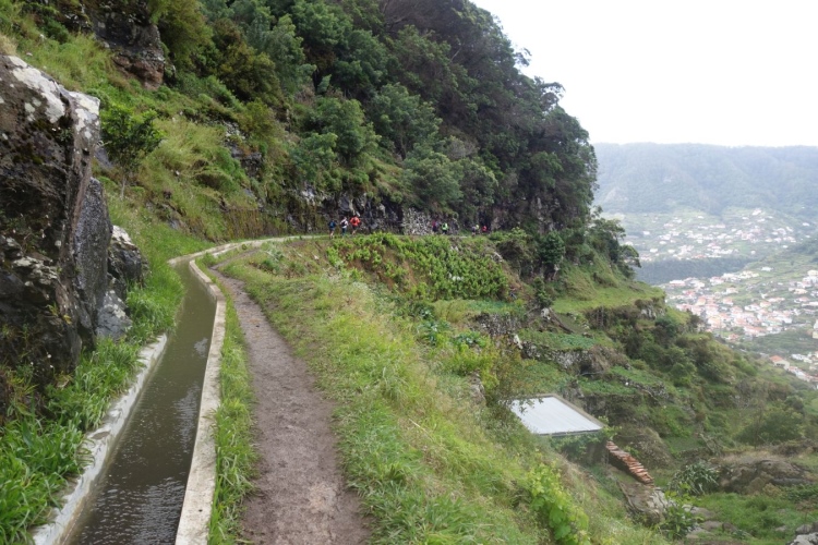 Unter uns taucht die Levada do Canical auf. Sie zieht sich von Canical bis Marocos. Als Wanderung sehr empfehlenswert. Wir biegen links ab und folgen dem matschigen Weg am Wasserkanal nun bis zum alten Canical Tunnel oberhalb von Machico.