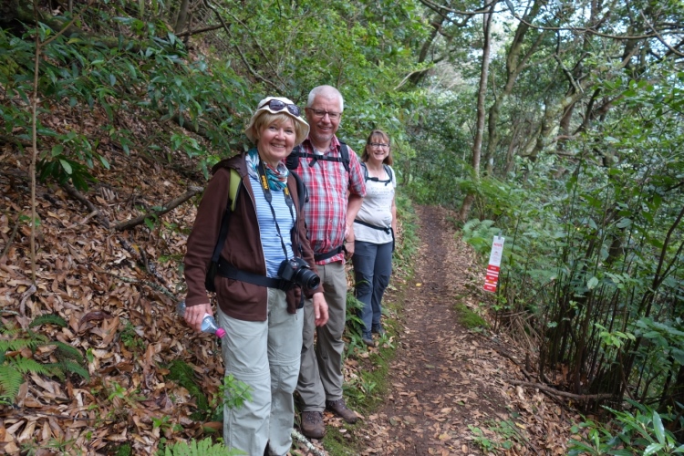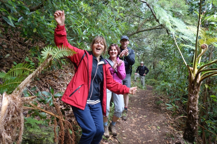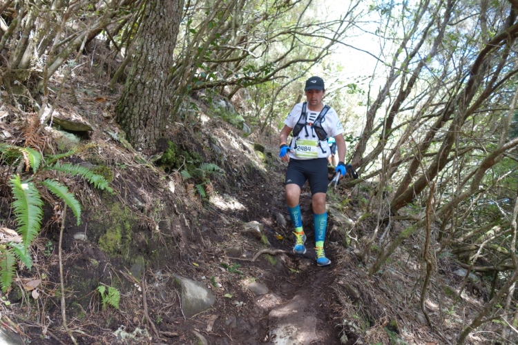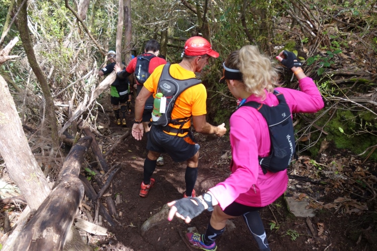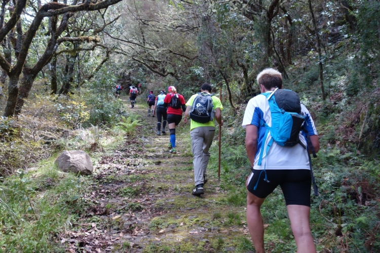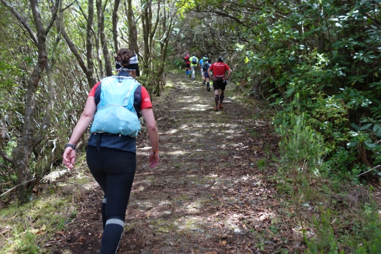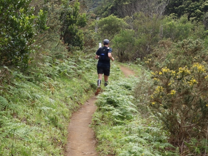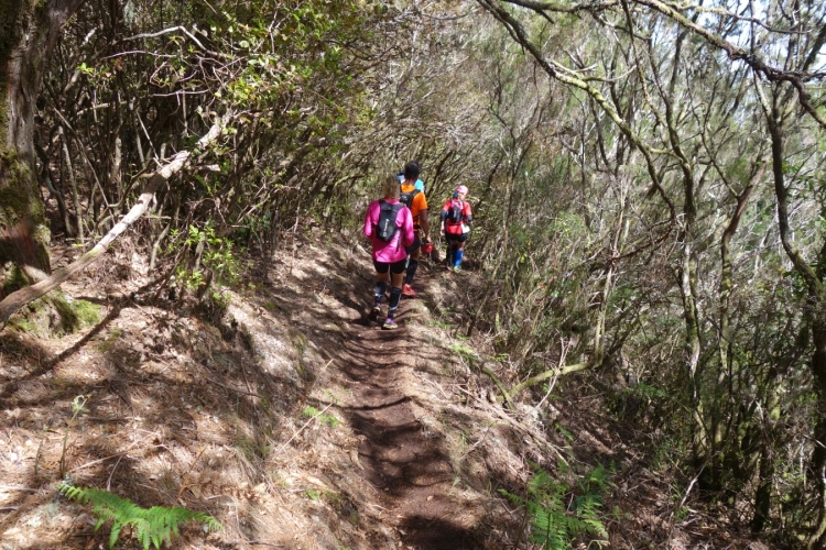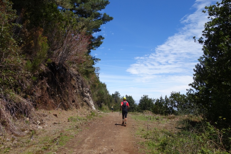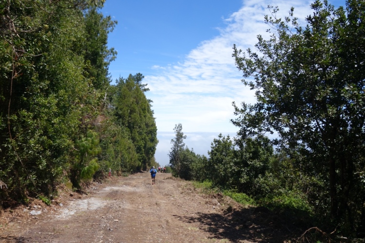 Die Pause hat mit gut getan. Zwei Drittel der Strecke sind fast rum und ich laufe. Im Gegensatz zu vielen anderen, die bereits im Gehen/Laufen-Modus sind. Das geht auch so weiter, als wir die breite Piste verlassen und auf einen schmalen Waldpfad wechseln. Einfach herrlich hier zu laufen. Ein Läufer dreht sich um sagt völlig zutreffend: „Das ist Trail!“ Recht hat er. Im Wald, zumeist Lorbeerwald, stehen auch etliche hohe Baumfarne. Sehr beeindruckend.
