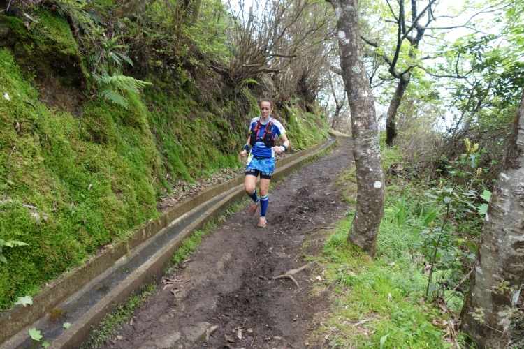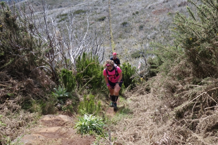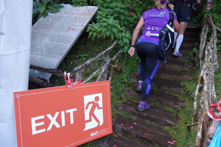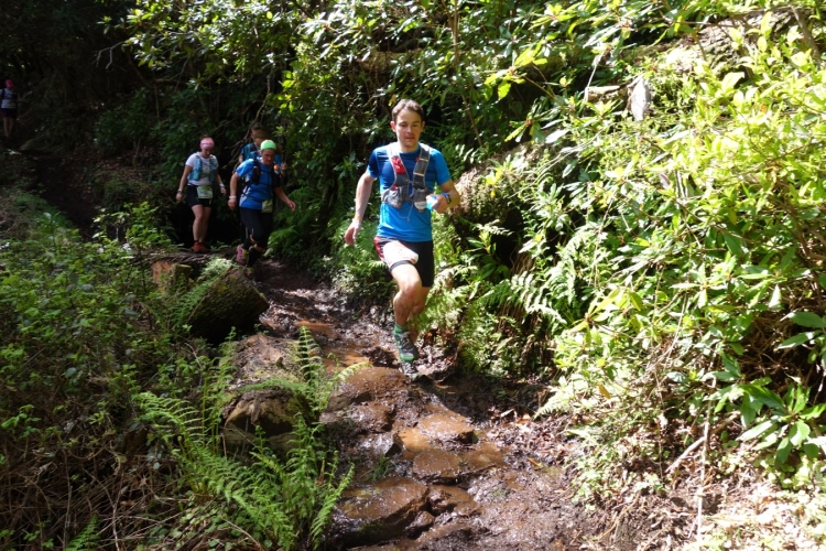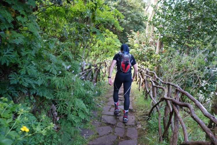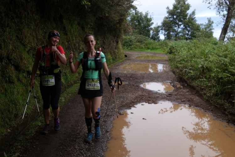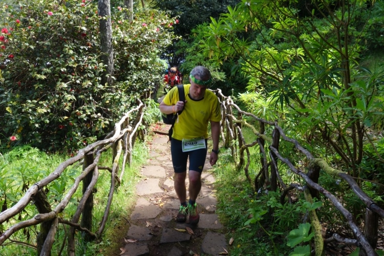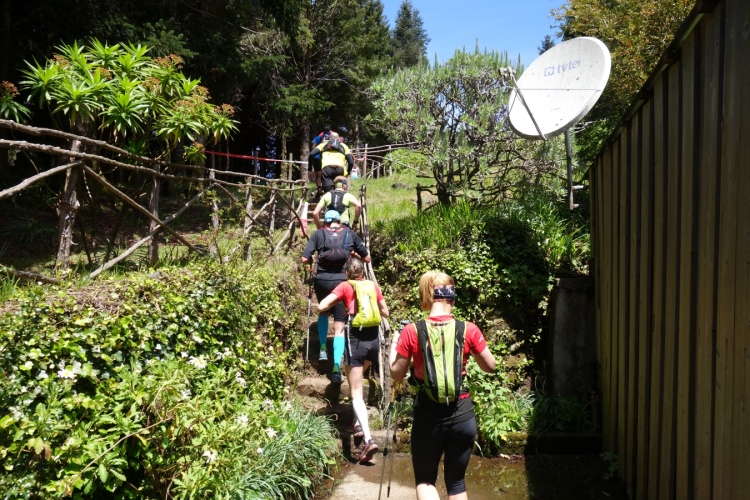Hinunter nach Ribeiro Frio lacht das Herz des Trailläufers. Abwärts wird richtig was geboten. Es ist lange steil, dazu vielfach matschig. Ich sehe einige Läufer stürzen, lasse aber stets die Kamera dezent weg. Einmal legt sich eine lila Schönheit direkt vor mir hin. Ich bin sprachlos. Es passiert halt nicht so oft, dass sich schöne Frauen mir zu Füßen werfen. Ihr ist aber wie den anderen nichts passiert und sie läuft direkt weiter.