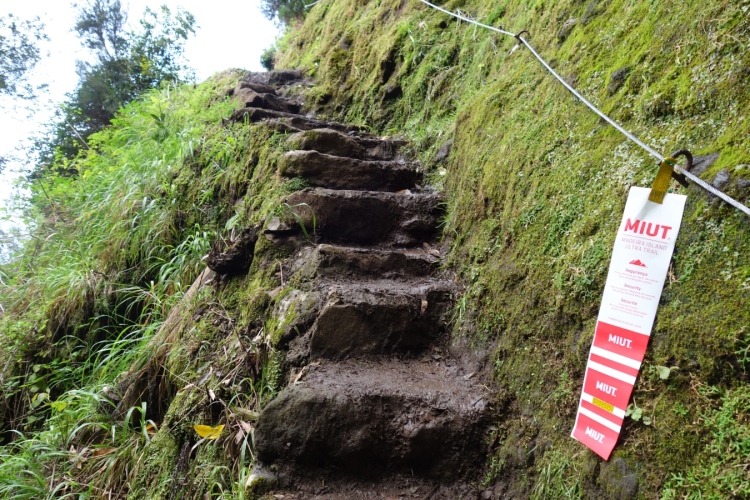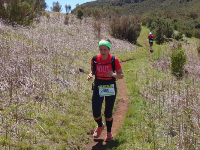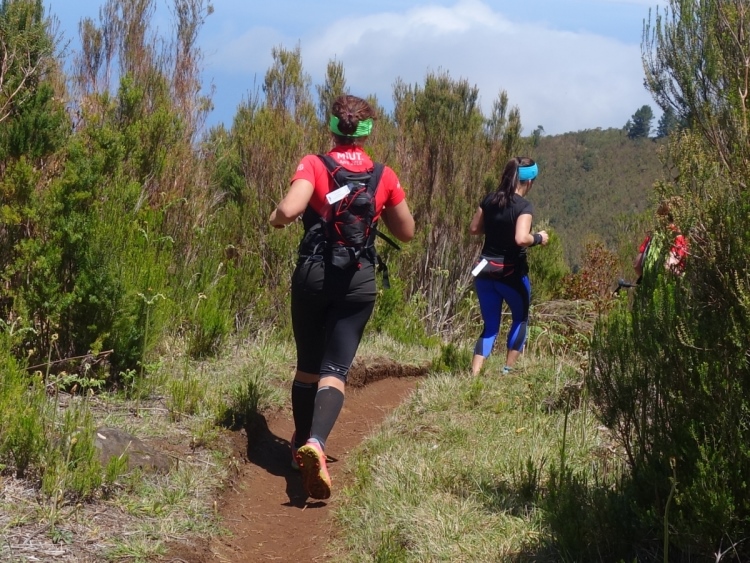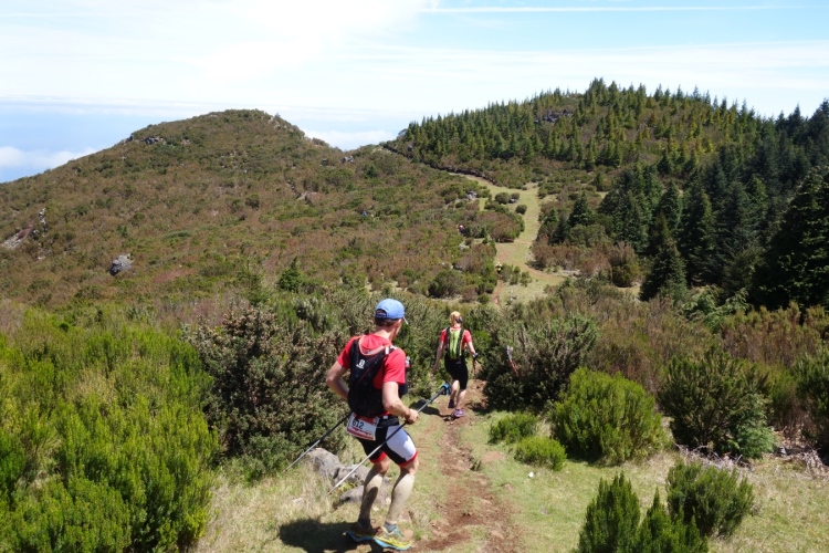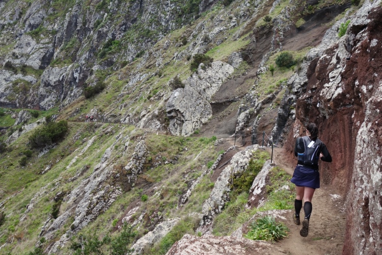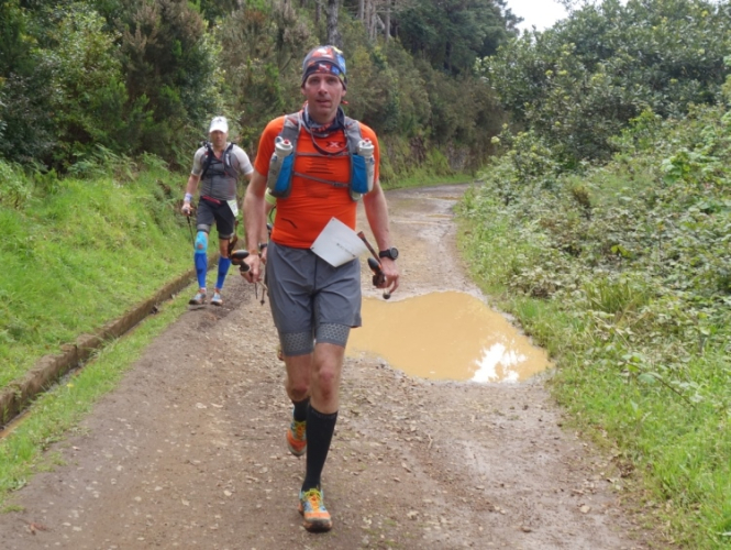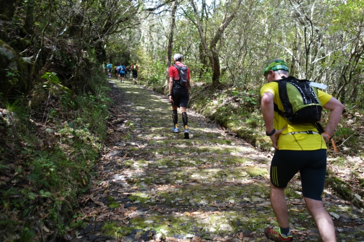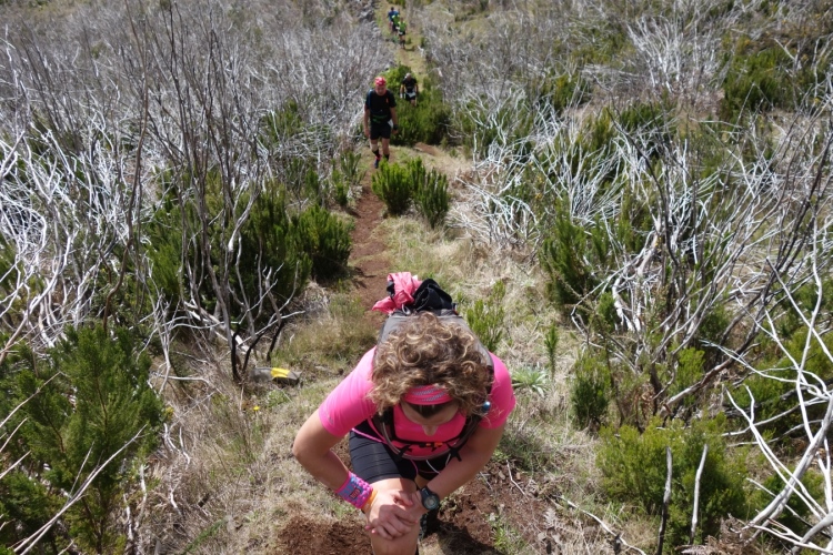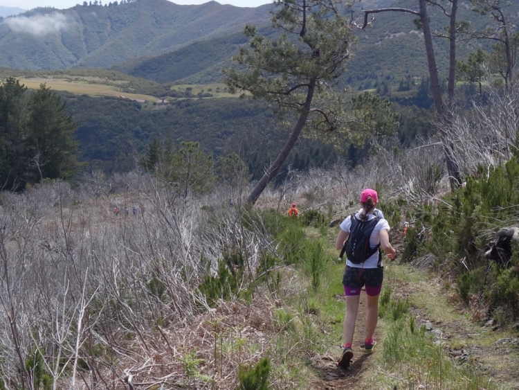 Hinunter nach Ribeiro Frio lacht das Herz des Trailläufers. Abwärts wird richtig was geboten. Es ist lange steil, dazu vielfach matschig. Ich sehe einige Läufer stürzen, lasse aber stets die Kamera dezent weg. Einmal legt sich eine lila Schönheit direkt vor mir hin. Ich bin sprachlos. Es passiert halt nicht so oft, dass sich schöne Frauen mir zu Füßen werfen. Ihr ist aber wie den anderen nichts passiert und sie läuft direkt weiter.