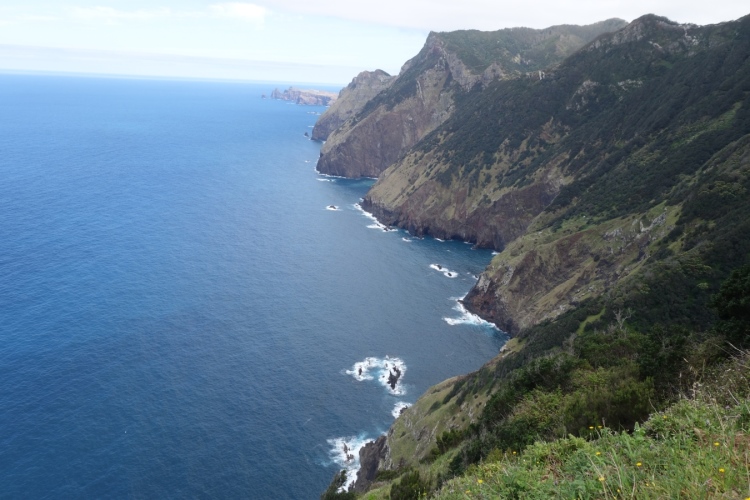 Der Rest der Strecke ist mir bestens bekannt, bin ich am Mittwoch doch genau hier gewandert. Eine breite Piste bildet die Ouvertüre, allerdings nicht lange. Die Piste wird zum Pfad, der sich an der rauhen Steilküste entlang schlängelt. Es geht im Prinzip auf einer Höhe bis zur Boca do Risco. Allerdings sind immer wieder mehrere Meter Steigung zu bewältigen.