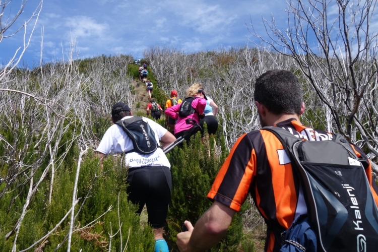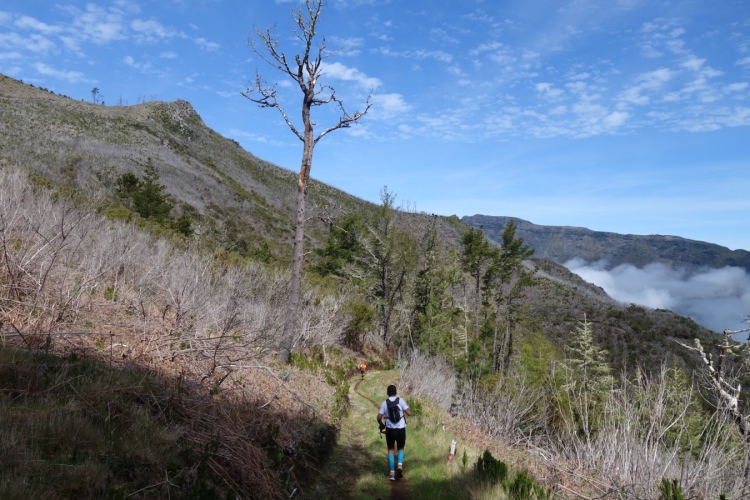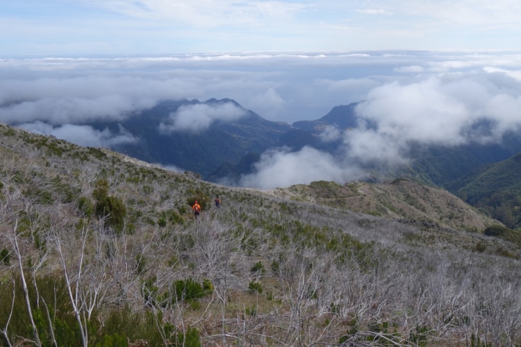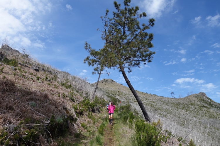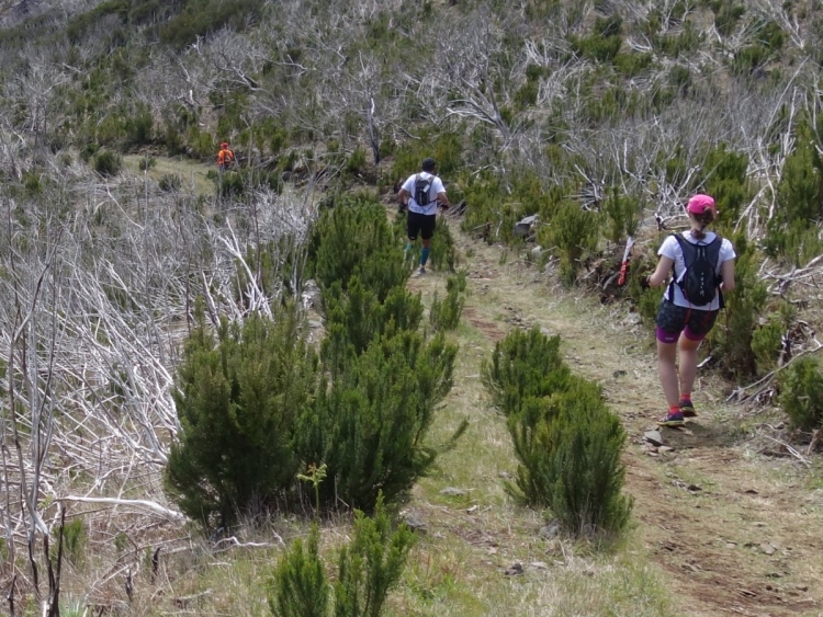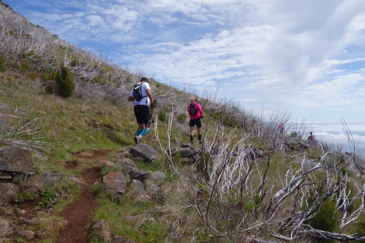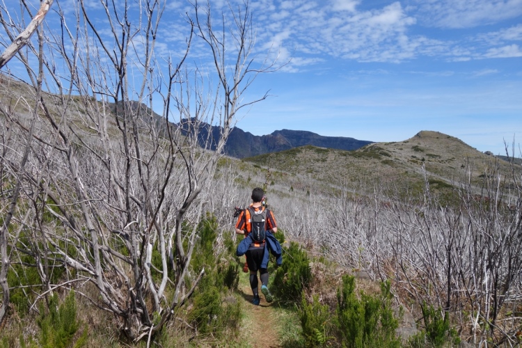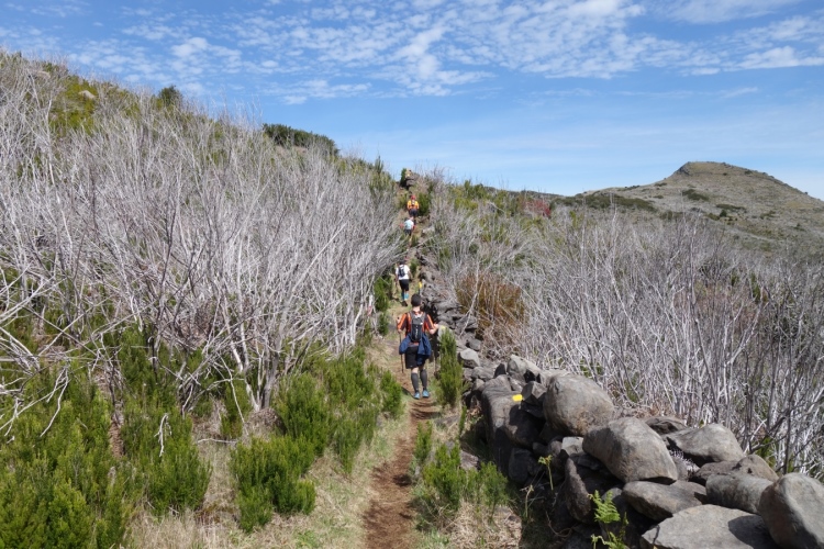 Wir müssen ständig kürzere Abschnitte aufwärts laufen. Statt des abgebrannten Hochwaldes sind nun Strauchgerippe und später hohe Baumheide an der Strecke. Diese ist im Übrigen bestens präpariert und auch markiert.