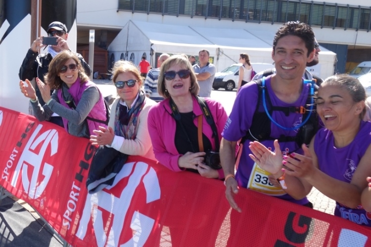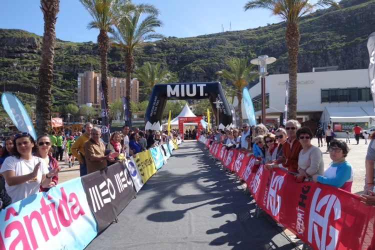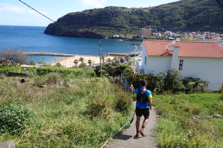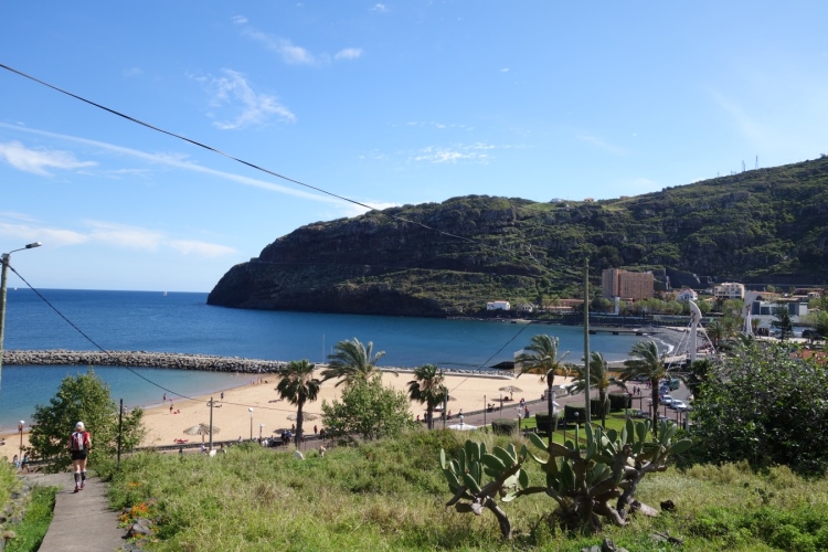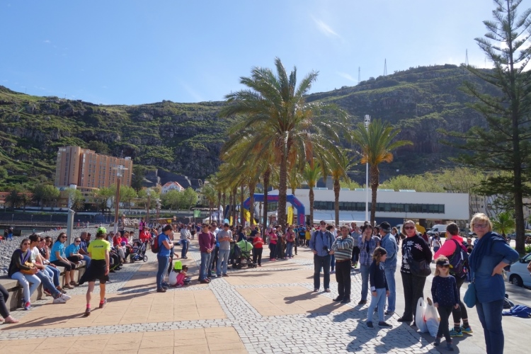 Ein Stück Straße noch abwärts und eine Treppenanlage hinab und wir sind am Strand von Machico. Hier ist richtig was los. Zuschauer sitzen auf der Strandmauer und auf Bänken und feuern die Läufer an.