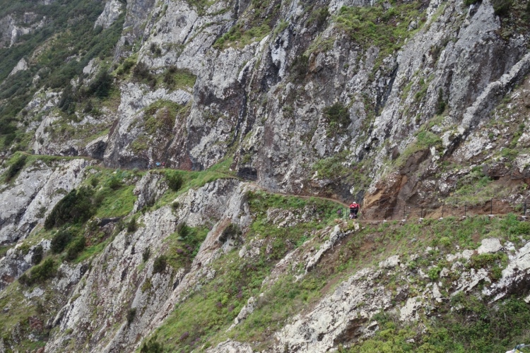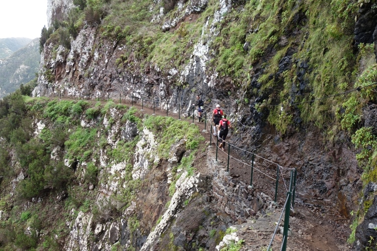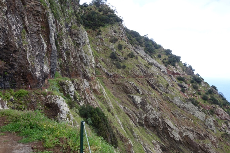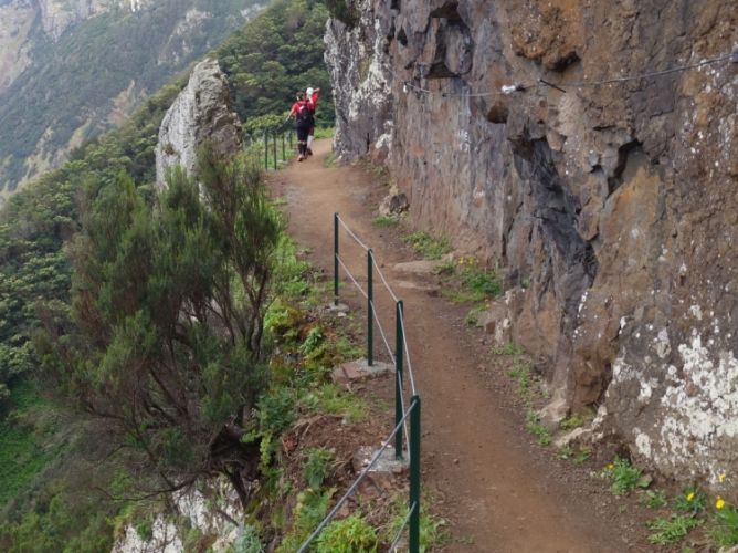 Besonders exponierte Stellen sind mit seitlichen Absperrungen und Drahtseil gesichert. Ich bin ganz begeistert, ein wahrlich beeindruckender Streckenteil. Und in der Ferne wird uns sogar der Blick auf Madeiras benachbarte Badeinsel Porto Santo geboten.