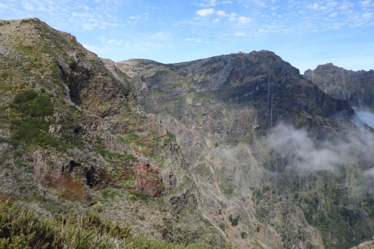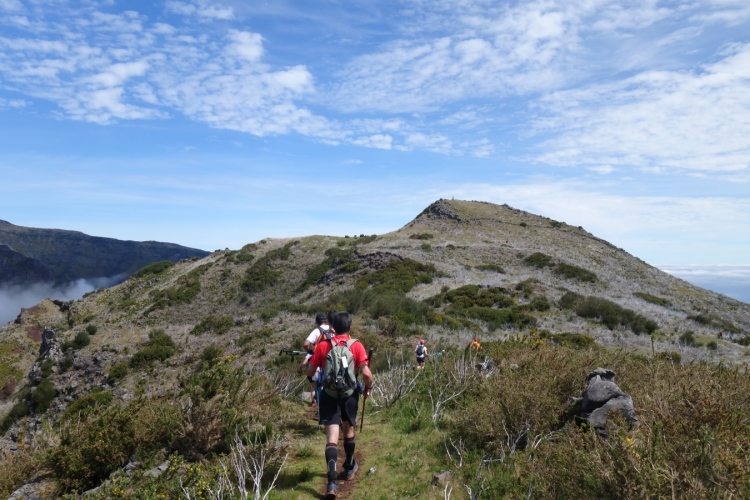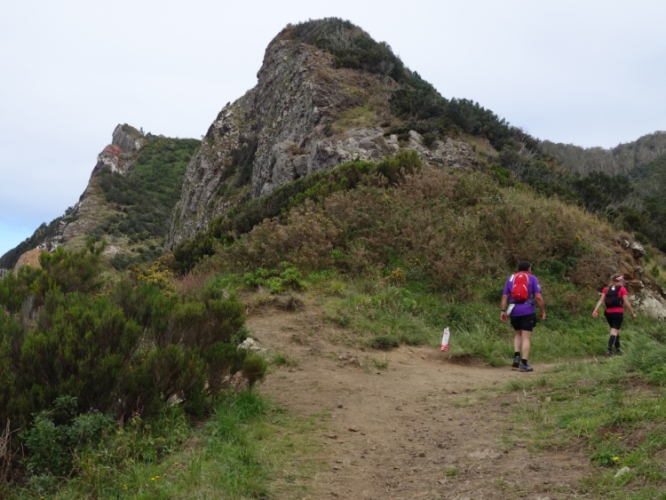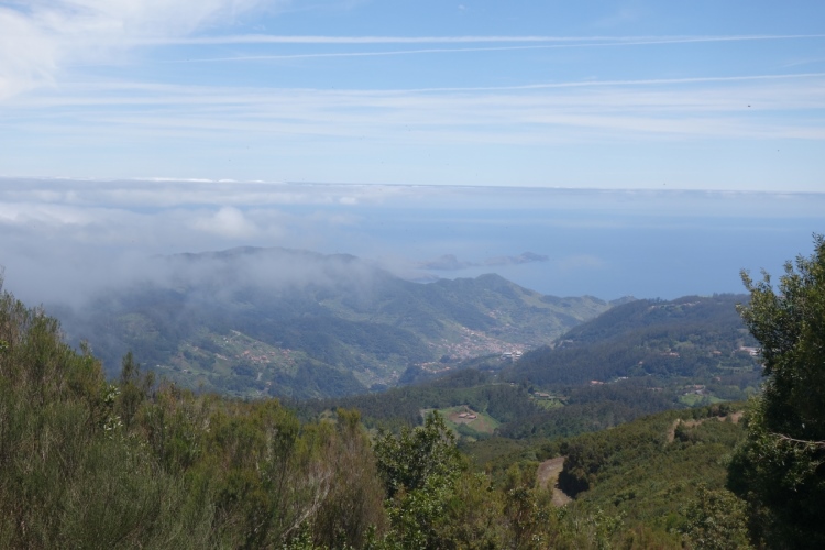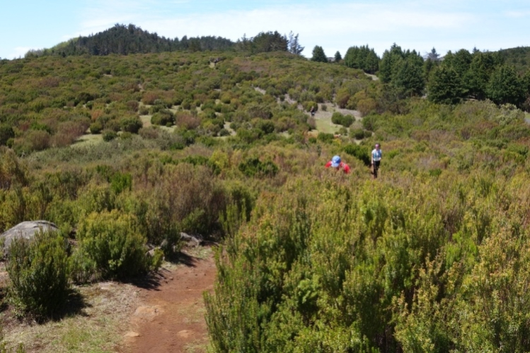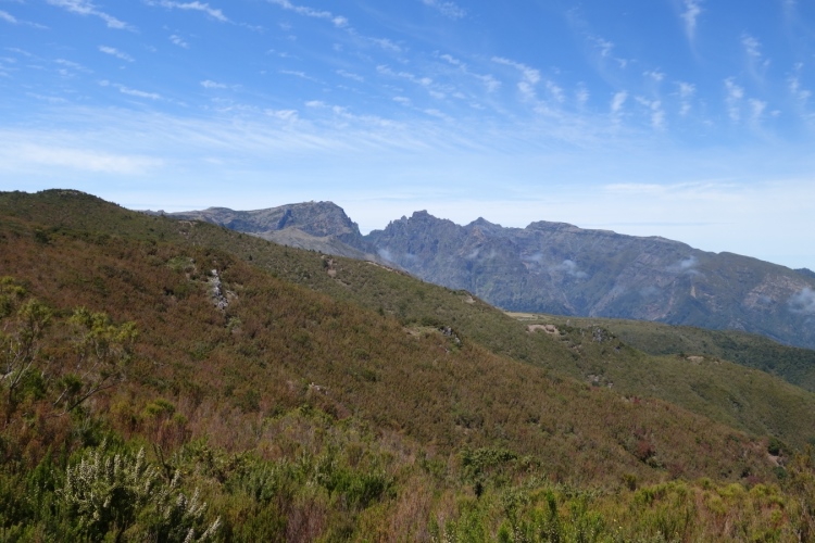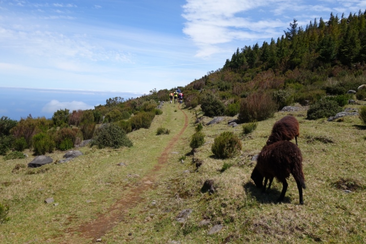 Teilweise führt die Strecke durch meterhohe Baumheide. Einmal laufen wir mitten durch eine Schafherde. Die Tiere lassen sich aber von den Zweibeinern beim Grasen nicht stören. Oftmals bieten sich uns tolle Weitblicke. Zurück ist immer noch die Radarkuppel auf dem Areeiro zu sehen, zur Seite liegt Faial mit dem beeindruckenden Adlerfelsen und voraus ist die Halbinsel Sao Lourenco zu sehen.