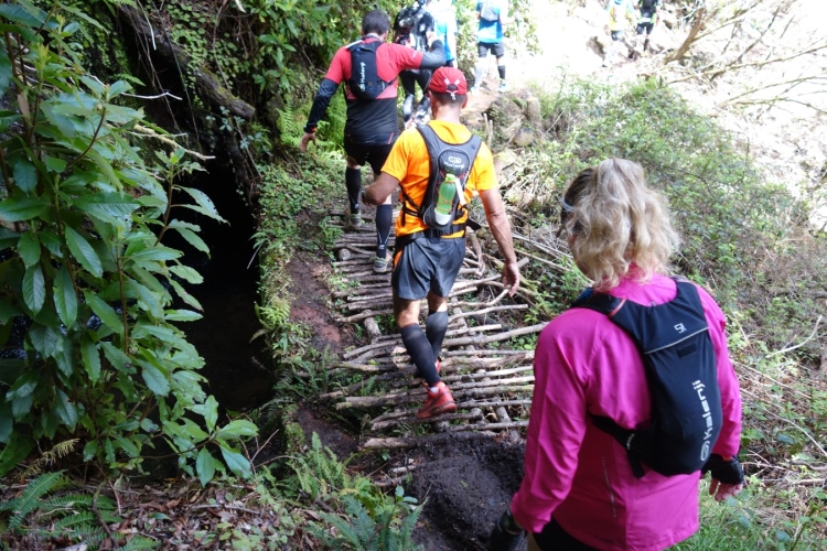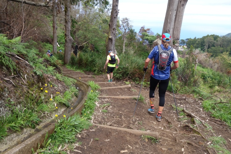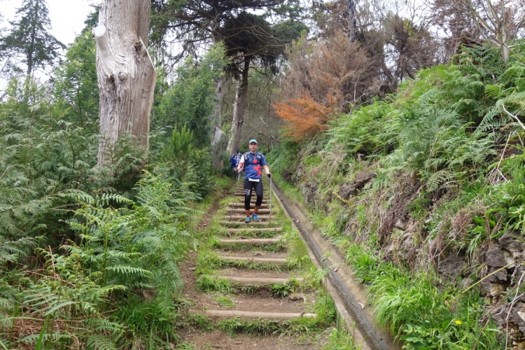 Es macht aber auch unverändert einen Riesenspaß, hier zu laufen. Die Strecke bietet vielfältige Abwechslungen und das Wetter spielt weiter mit. Spaß macht mir sogar das Abwärtslaufen entlang der Levadas auf den Holzstufen. Ich trete einfach auf die Balken drauf und nehme dann den nächsten Balken der nächsten Stufe ins Visier. Und so geht das bis nach Portela.