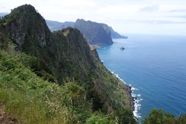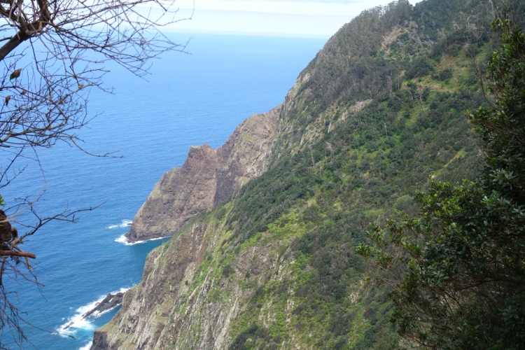 Es wird wieder sehr steil und auch matschig. Man muss höllisch aufpassen. Dieser Abschnitt erfordert noch einmal höchste Konzentration. Gut, dass ich mich in Portela für diese Herausforderung gestärkt habe. Ab und an gibt der Wald den Blick frei zur beeindruckenden, steil abfallenden Nordküste. Auch unser Weg von Larano zur Boca do Risco ist zu sehen.