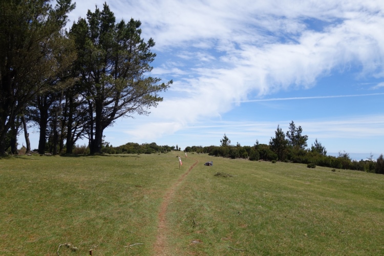 Aber endlich ist vor dem alten Straßentunnel nach Canical an einem Wasserhäuschen das Ende des Wasserlaufs erreicht und wir queren die Straße, um ein Stück weiter abwärts entlang einer weiteren Levada zu laufen. Bis zu deren Ende. Jetzt heißt es einen letzten steilen Abstieg über eine Wiese zu bewältigen. Der Laufweg ist bestens präpariert, sprich frisch gemäht.