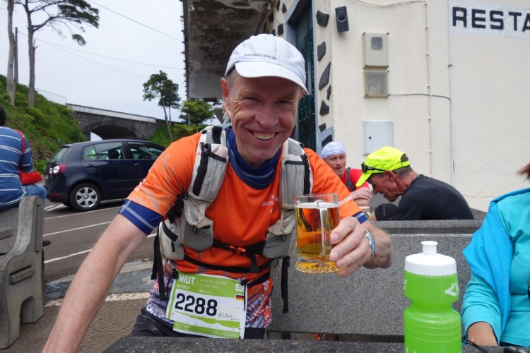 Beschwingt laufe ich die letzten Meter ins Ziel. Nach 7:10 Std. ist dieser Trailgenuss über 43 Km auf Madeira für mich zu Ende. Im Ziel gibt es Wasser - über meinen Kopf. Denn der braucht dringend Kühlung.