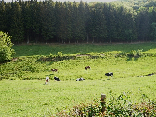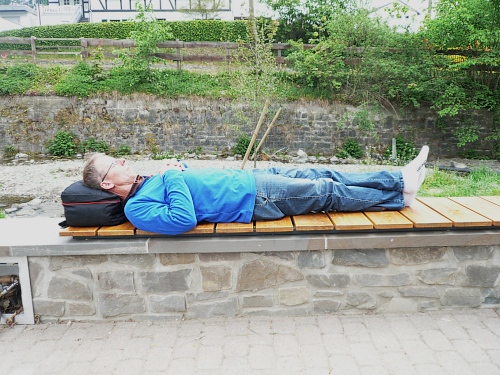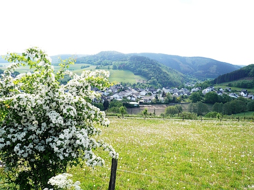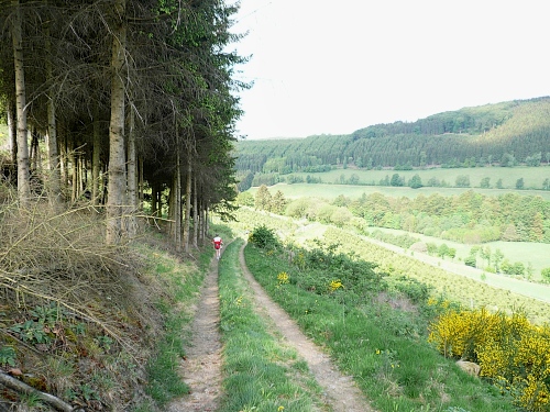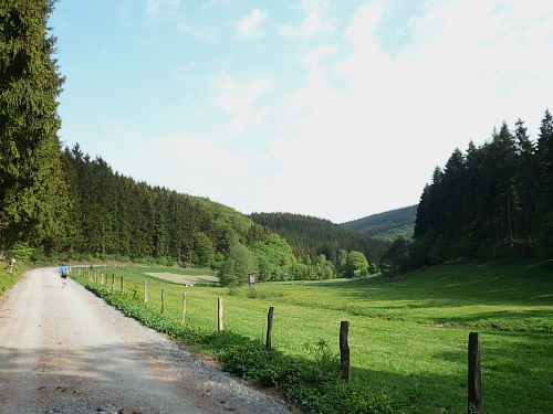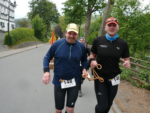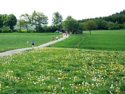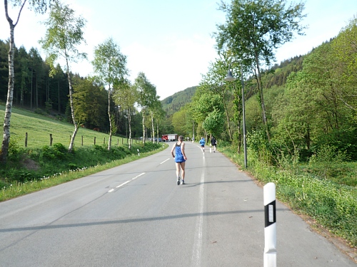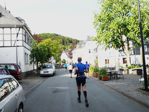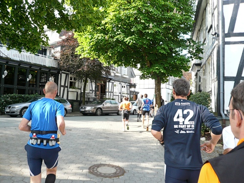 Die ersten 13 km sind zum Warmlaufen, wunderschöne Landschaft, super Luft, tolle Aussichten, die Sonne wärmt, der Ginster duftet und jede Menge Verpflegungsstände. Es gibt auch mein bevorzugtes isotonisches Getränk. Irgendwie sind wir auch am Hollenhaus vorbeigekommen, dort wo die Hollen in den mit grünen Flechten bedeckten Schiefergesteinen hausen, aber die sind schon lange nicht mehr gesehen worden. Was ich jetzt sehe sind hübsche Fachwerkhäuser, die sich in den steilen Tälern ducken, grüne Wiesen und Blumen.