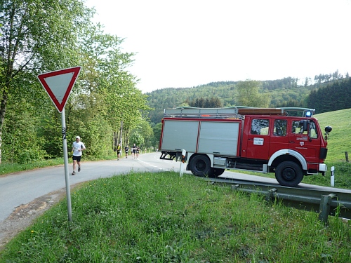Die ersten 1,5 Km fährt ein Führungsfahrzeug voran, damit wir den Weg durch das sympathische Bödefeld auf die Naturlaufstrecke finden.