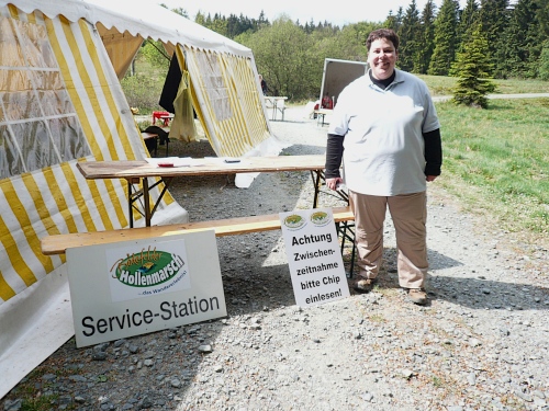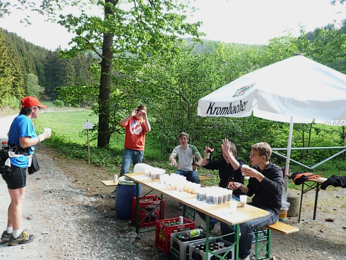 Zurück in Bödefeld beginnt der Ernst des Laufes. Es geht steil nach oben auf die Hunau, wie der 818 m hohe Berg genannt wird. Im Hintergrund ist der Kahle Asten (841) zu sehen, den die Langstreckler erklimmen müssen. Aber die Verpflegungsstellen sind schon der Hit! Die Hollen, die dort aushelfen, haben genausoviel Spass wie ich, hahaha.