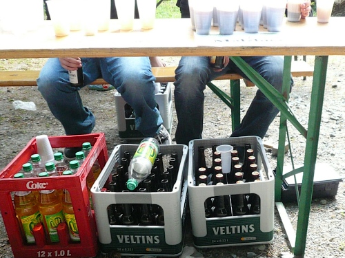 Oben, vor dem Fernsehturm (km 30 sind geschaftt, ich auch) erstmal was Isotonisches, wenn ihr wisst was ich meine. „Wann kommt der Koks?“ werde ich gefragt. Ja, der Koks kommt um 18 Uhr, heisst eigentlich Patrik Cox und hat früher bei den Schürzenjägern gespielt, der heizt heute Abend im Ziel ein. Bis dahin werde ich angekommen sein.