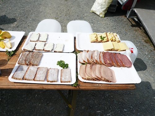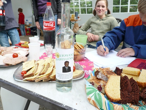 Ich bin noch nicht richtig angekommen, da haut es mich schon um: Das Frühstücksbuffet ist im Startpreis (20-25 €) inbegriffen. Nicht so ein Jugenherbergen-Allerlei, sondern von der gehobeneren Sorte. Spitze! Übernachtung in der Turnhalle (5 € ).