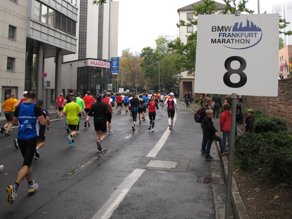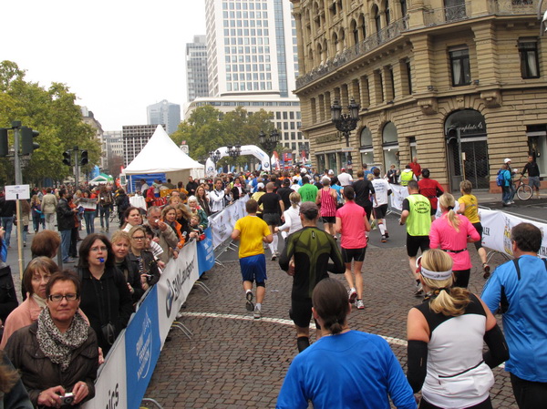 Noch 7 Kilometer. Wieder das Bankenviertel. Die Gegenbahn ist wesentlich belebter als unsere Seite. Links die Krawatte, vor uns die Türme der Deutschen Bank, dann die Alte Oper, dann die EZB. Das Läuferfeld ist lichter, man sieht jetzt das Zeltlager der Protestierer. Bloco X spielen gerade ein melodiöses Stück und dreschen erst wieder auf ihre Trommeln ein, als wir vorbei sind. Das Viertel bebt noch immer. An der Hauptwache erklärt Artur Schmidt den Zuschauern gerade, warum Frauen so gut Marathon laufen.