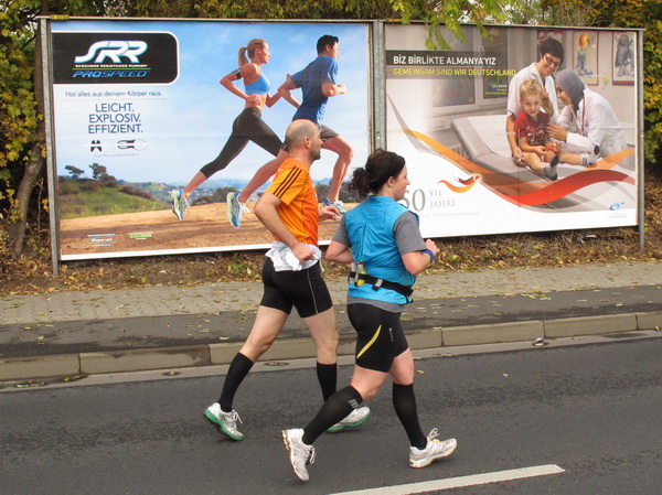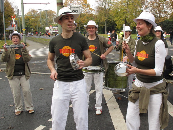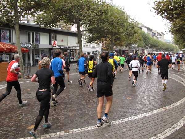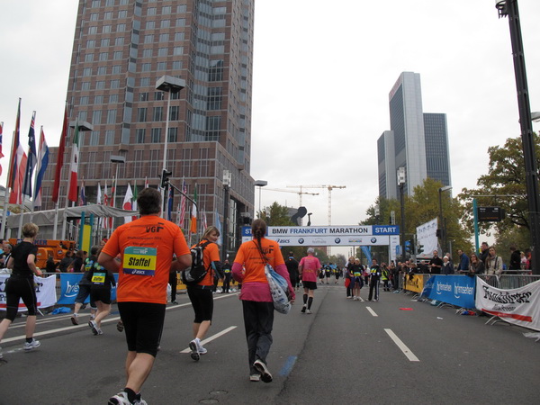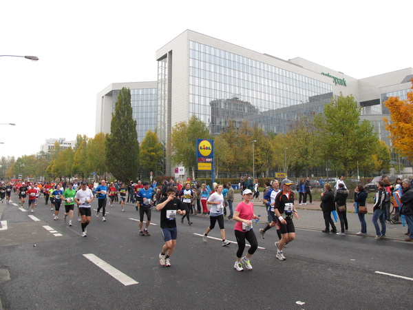 Etliche Musikgruppen haben sich auf der Straße der Leiden postiert, um die Marathonis am Laufen zu halten. Und einmal ist auch das vorbei. Der Pumuckl markiert vor einer Kneipe das Ende der Durststrecke. Von der Frankenallee hat man einen schönen Blick auf den Messeturm. Davor ist eine riesige Baugrube. Hier entsteht das größte Einkaufszentrum Europas.