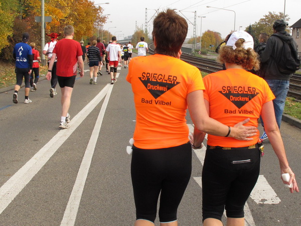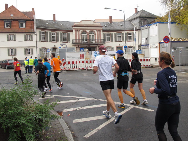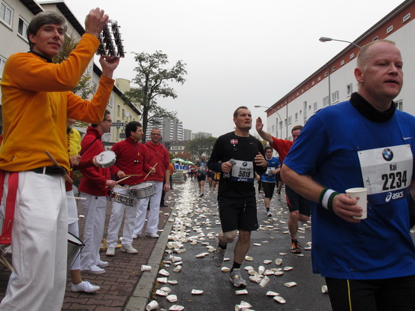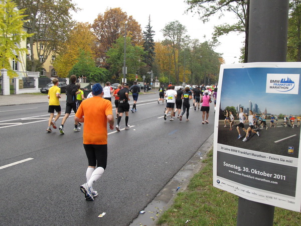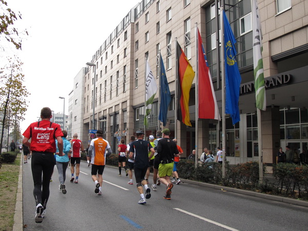 Wenn man von der Autobahn auf die Verwaltungstürme von Niederrad schaut, kann man daran nichts Schönes finden. Läuft man jetzt beim Marathon durch diese Gegend, bekommt man ganz andere Eindrücke. Zwischen den Türmen ist viel Grün und bunt gefärbtes Laub. Trostlos sieht anders aus. Und dann sind da noch die Schrebergärtner, die ihr Frühstück am Marathontag an der Strecke zu sich nehmen. Zu Hausmacher Blutwurst, leicht angeräuchert, sage ich ja, zu Rotwein nein. Gleich kommt die nächste Verpflegungsstelle. Warmer Tee ist mir lieber.