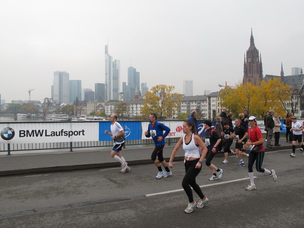Als nächster Höhepunkt wartet die Alte Brücke (km 13) auf uns, das Wahrzeichen des Frankfurter Marathons. Von hier hat man einen sagenhaften Blick auf Skyline und den Dom. Deshalb stehen auf dem ersten Stück auch mehr Fotografen als Zuschauer, die sich erst in der Kurve sammeln, wo die Läufer zum Mainufer abbiegen.
