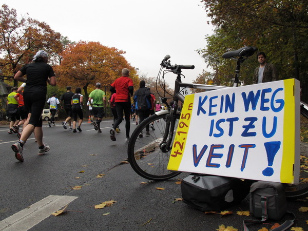 Ein Drittel der Strecke haben wir absolviert. Zwei Kilometer geht es jetzt auf der vierspurigen Straße schnurgeradeaus. Herbstlich gefärbte Bäume säumen die Strecke, lärmende Zuschauer sind jetzt eher selten. „Kein Weg ist zu veit“, teilt uns ein Fan mit. Und das Straßenverkehrsamt appelliert an alle Völker und Läufer: „Durchhalten!“ Ein Trachtenpaar meint zu wissen, dass da noch was geht.