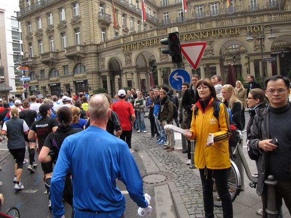 Unsere erste Runde durchs Bankenviertel ist kurz, nach 4 Kilometern sind wir im vornehmen Westend und laufen Richtung Palmengarten. Bevor es die Bockenheimer Landstraße wieder stadteinwärts geht, kommt die erste Verpflegungsstelle. Schnell hat man sein Getränk, denn an langen Tischreihen kann man sich beidseitig der Straße bedienen.
